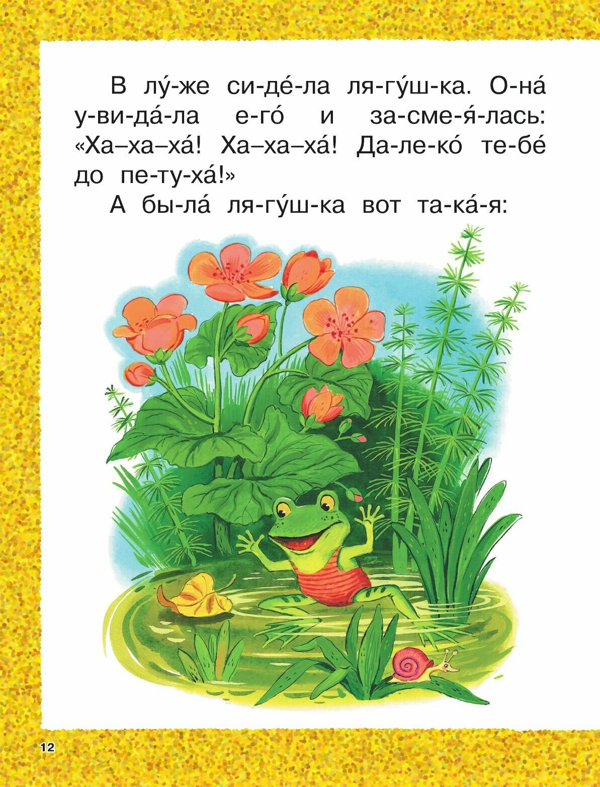 Покупала книгу дочке 7 лет для самостоятельного чтения, т.к. текст напечатан крупными буквами с разбивкой на слоги. Однако, она один прочитала и забросила. Но, как оказалось, книга больше подошла младшей дочке 2,5 лет: в книге на каждой странице картинки, отражающие смысл текста, а самого текста мало на странице, что очень важно при чтении книг малышам. Теперь перечитываем минимум 2 раза в день, а местами дочурка наизусть сама рассказывает)))