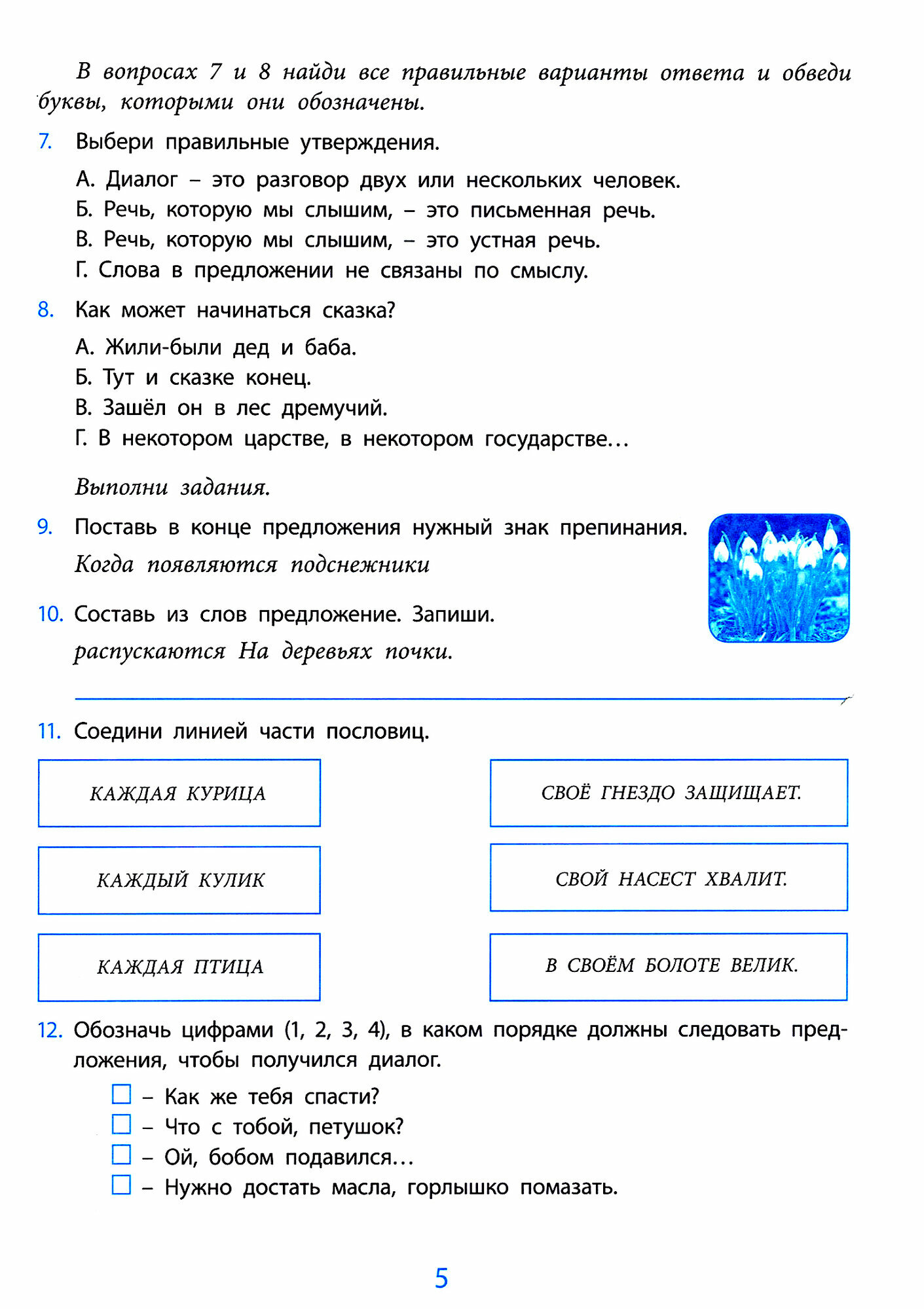 Пособие составлено в полном соответствии с Федеральным государственным образовательным стандартом начального общего образования и содержит проверочные работы (тесты) по темам курса русского языка в первом классе. Все проверочные работы представлены в четырёх вариантах, каждый из которых включает двенадцать заданий. Задания разнообразны по типологии (выбор одного или нескольких правильных ответов, восстановление текста, установление соответствия, заполнение схем, конструирование предложений и др.), направлены на формирование у обучающихся предметных умений, универсальных учебных действий, основ логического мышления, а также обеспечивают проведение качественного оценивания достижения планируемых предметных и метапредметных результатов.