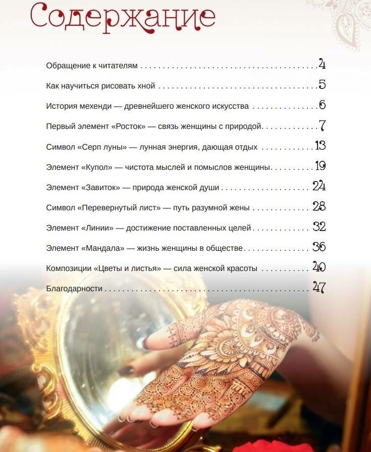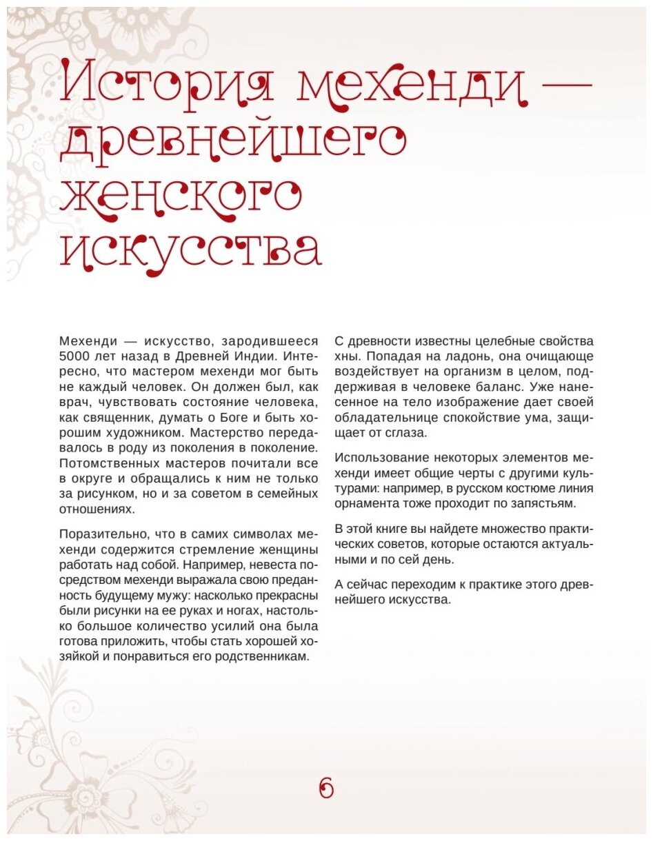 Книга вышла в 2017 году. К этому времени в России сложилась достаточно сильная школа мастеров мехенди, признанная во всём мире. К сожалению, данная книга не отразила этого достижения. Вдобавок автор, похоже, вообще мало знакома с теорией и практикой мехенди. Так что эту книгу стоит только смотреть, поскольку в ней использованы работы известных в России и за рубежом мастеров.