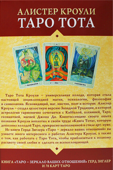 Таро Тота Кроули - колода, которая стала настоящим путеводителем в мир магии, психологии, философии и символизма. Данное Таро выполнено в стиле ар-нуво. Пользуясь набором "Таро-зеркало ваших отношений", вы сможете узнать о том, как работать с Таро Тота, как свою любовь привести к расцвету, а также узнаете много интересного о работах Алистера Кроули.
