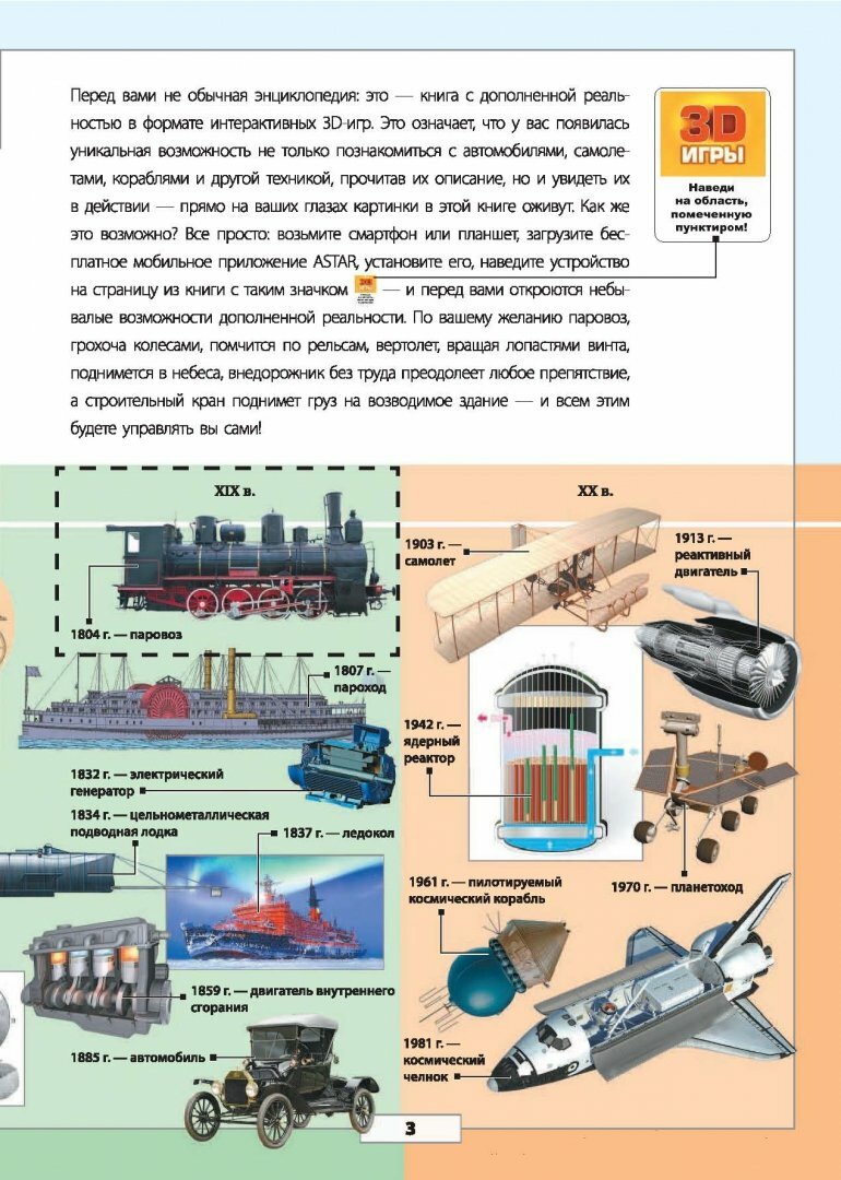 К сожалению, далеко не каждый из нас может отправиться в плавание на круизном лайнере или стать пилотом самолёта, увидеть, как собирают на заводе автомобиль или как устроена электростанция. Но все возможно, если вы откроете эту книгу. Ведь у вас в руках уникальное издание с дополненной реальностью (AR) в формате интерактивных 3D-игр. Это значит, что благодаря современным технологиям вы будете не просто читать текст и рассматривать иллюстрации, а сможете прямо на страницах книги увидеть всю технику в действии и даже услышать её! Причём вы сами приведёте в действие паровоз, посидите в вёртолете, поднимете на стреле строительного крана груз на возводимое здание, поучаствуете в гонках на суперкаре. А насколько зрелищным всё это будет - зависит только от вас! Реалистичные визуальные и звуковые спецэффекты, которыми сопровождается игра, сделают чтение этой книги ещё более захватывающим.