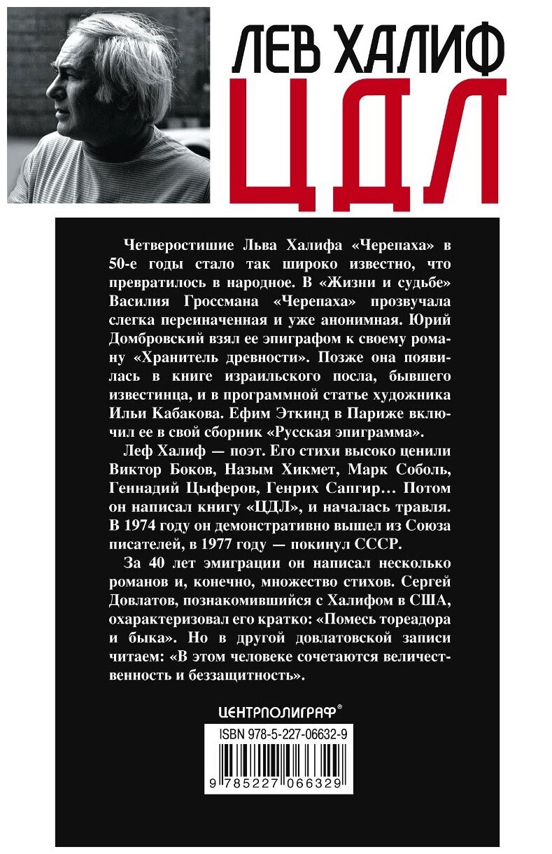 Лев Халиф - русский поэт, прозаик, автор знаменитого четверостишия "Черепаха", которое в 50е годы стало фольклорным. "Черепаха" ходила в списках, ее цитировали в спектаклях Эдлиса и брал эпиграфом Юрий Домбровский, но неизменно снимала цензура, тем более если она шла под именем автора. Однажды "Черепаха" была напечатана миллионным тиражом на обложке радиожурнала "Кругозор". В роман В. Гроссмана "Жизнь и судьба" "Черепаха" попала уже как фольклор. В 1977 году Халифа буквально вытолкнули в эмиграцию. "ЦДЛ" и роман "Пролом" были написаны на чужбине.