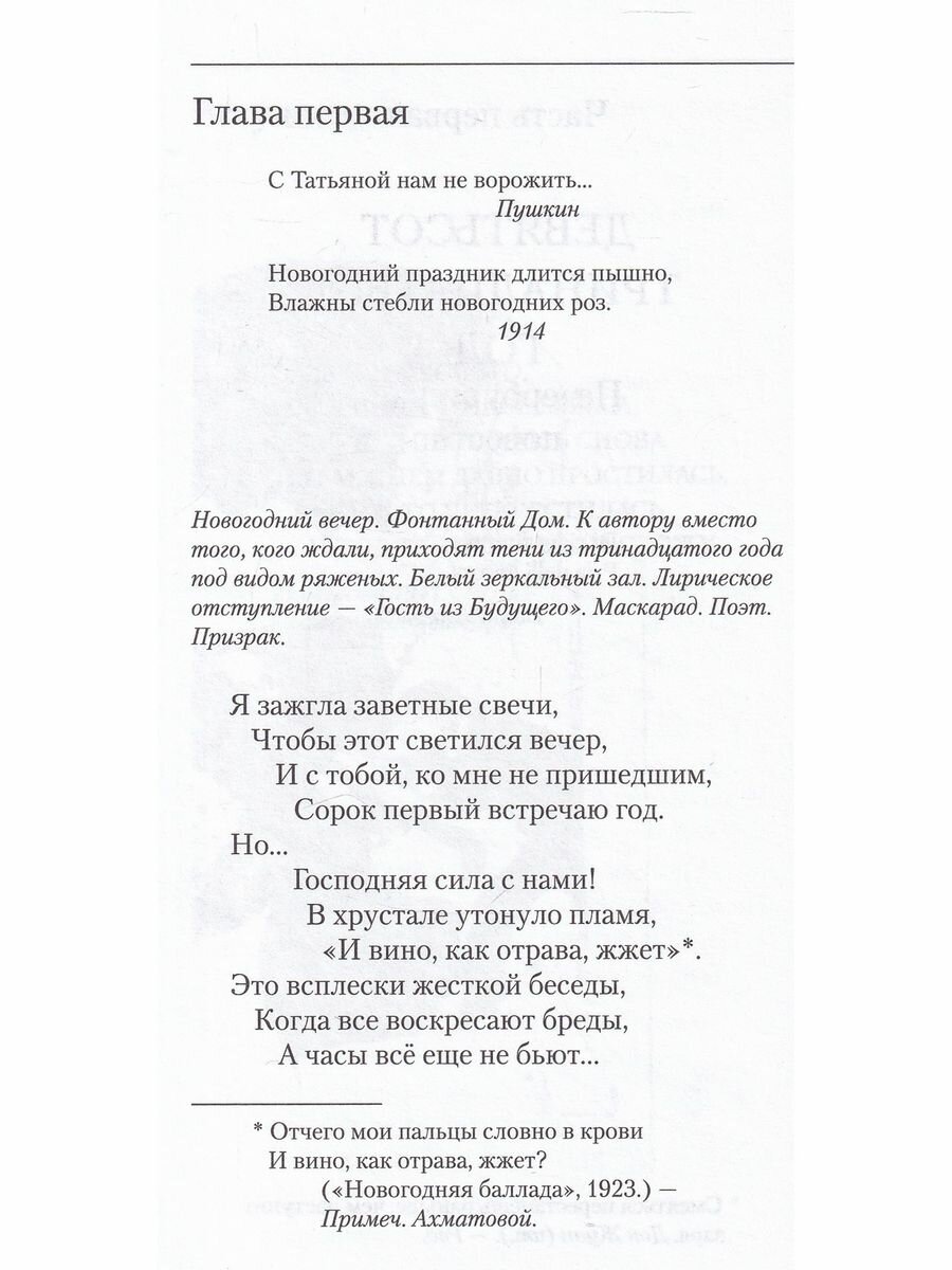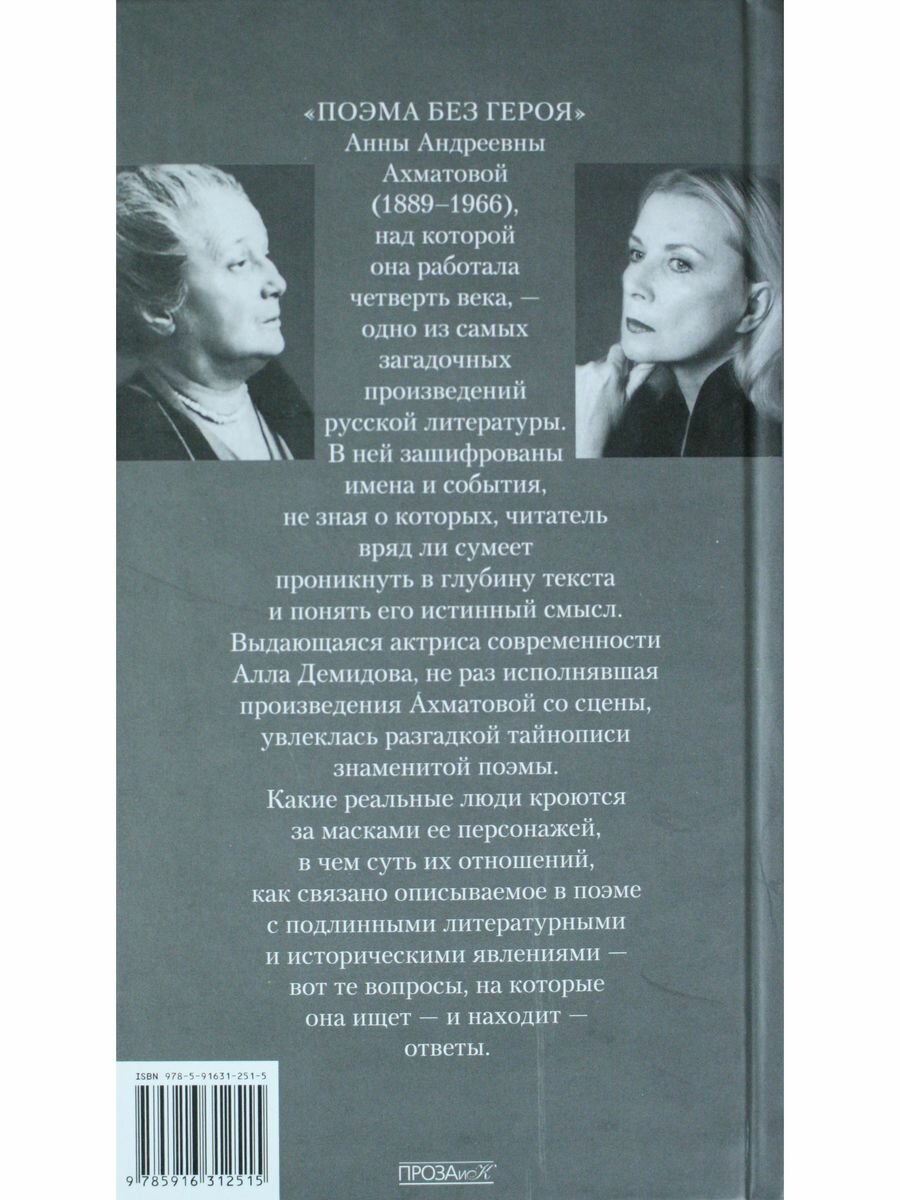 Выдающаяся актриса Алла Демидова, не раз исполнявшая произведения Ахматовой со сцены, увлеклась разгадкой тайнописи знаменитой поэмы. Какие реальные люди кроются за вымышленными именами ее персонажей, в чём суть их отношений, как связаны описываемые события с подлинными литературными историческими явлениями - вот те вопросы, на которые она ищет - и находит - ответы. Актриса признается, что просеяла через свою память множество материалов: письма, дневниковые записи самой Ахматовой, ее стихи, воспоминания и комментарии ее современников. И эта работа вылилась в книгу "Ахматовские зеркала".