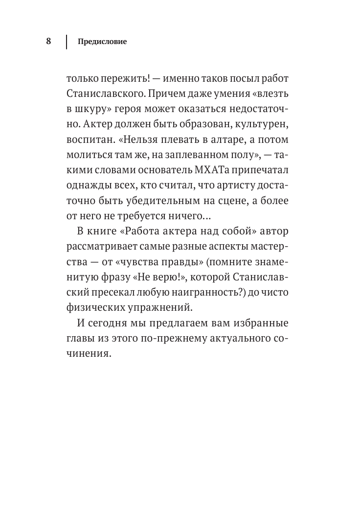 Первое, с чем ассоциируется имя Константина Сергеевича Станиславского, - это его знаменитое "не верю!", задающее тот уровень, которому должен соответствовать актер. О том, что именно нужно делать, чтобы соответствовать, рассказывается в этой книге. Как исполнить свою роль правдиво, в соответствии с предлагаемыми обстоятельствами, как избежать мышечных зажимов, как сделать игру на сцене убедительной, идейно наполненной? Станиславский щедро делится премудростями профессии, раскрывая их на примерах.