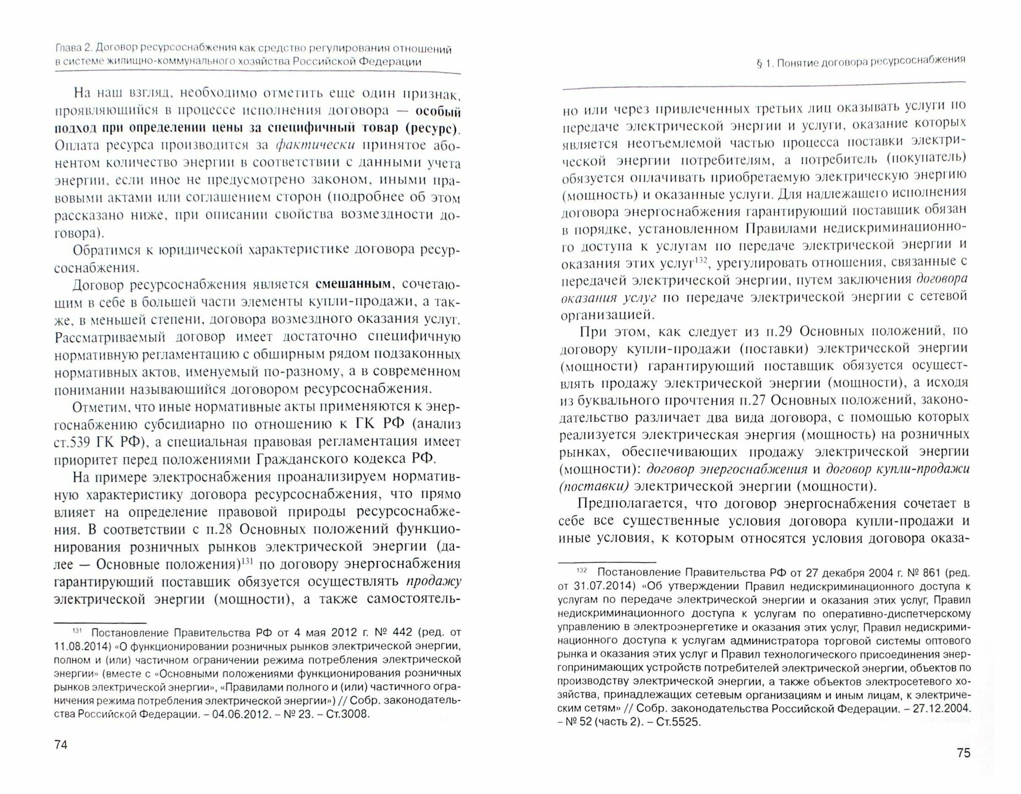 Написана понятным языком. Интересно читать, очень полезная.В представленной монографии раскрыта природа отношений по ресурсоснабжению через три основных признака: сущность понятия «энергии» («ресурса»); доставка ресурса при помощи присоединенной сети; оказание коммунальных услуг собственникам жилых помещений как конечным потребителям. В работе показано, что ресурс, наряду с вещью, является самостоятельным объектом гражданских прав, сформулированы понятия «ресурс», «договор ресурсоснабжения» с определением их признаков, определены стороны договора ресурсоснабжения, выведено понятие «ресурсоснабжение», уделяется немало внимания вопросам ответственности субъектов ресурсоснабжения при нарушении обязательств.