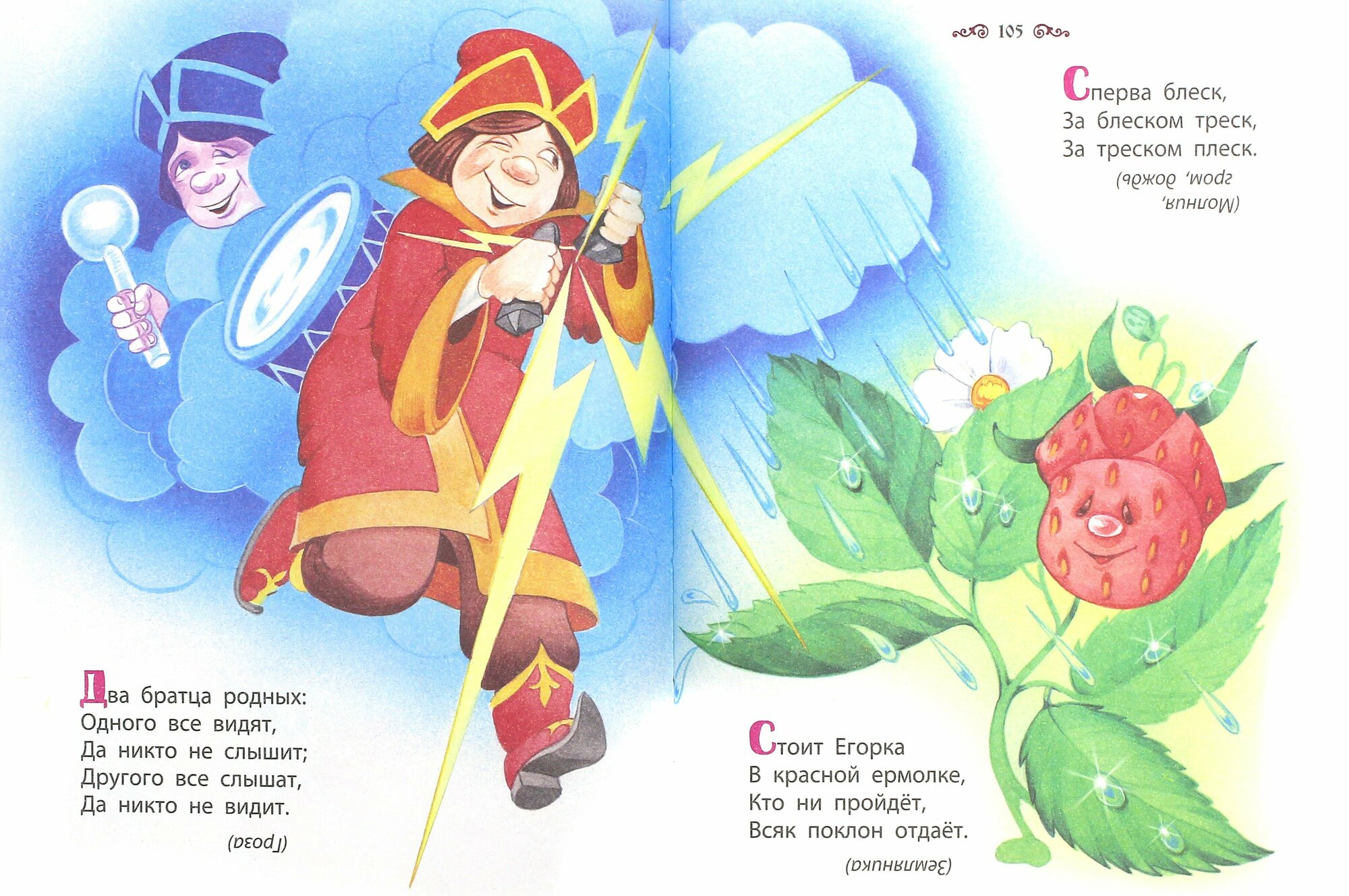 Книжка чуть больше форматаА5. В толстой, лакированной обложке. Страницы офсет, немного желтоватого оттенка, приятные на ощупь. Иллюстрации цветные, яркие на каждой странице, всегда к сказке, загадке, скороговорки и т.д. Иллюстрации на любителя, есть красивые, а попадаются и страшные.