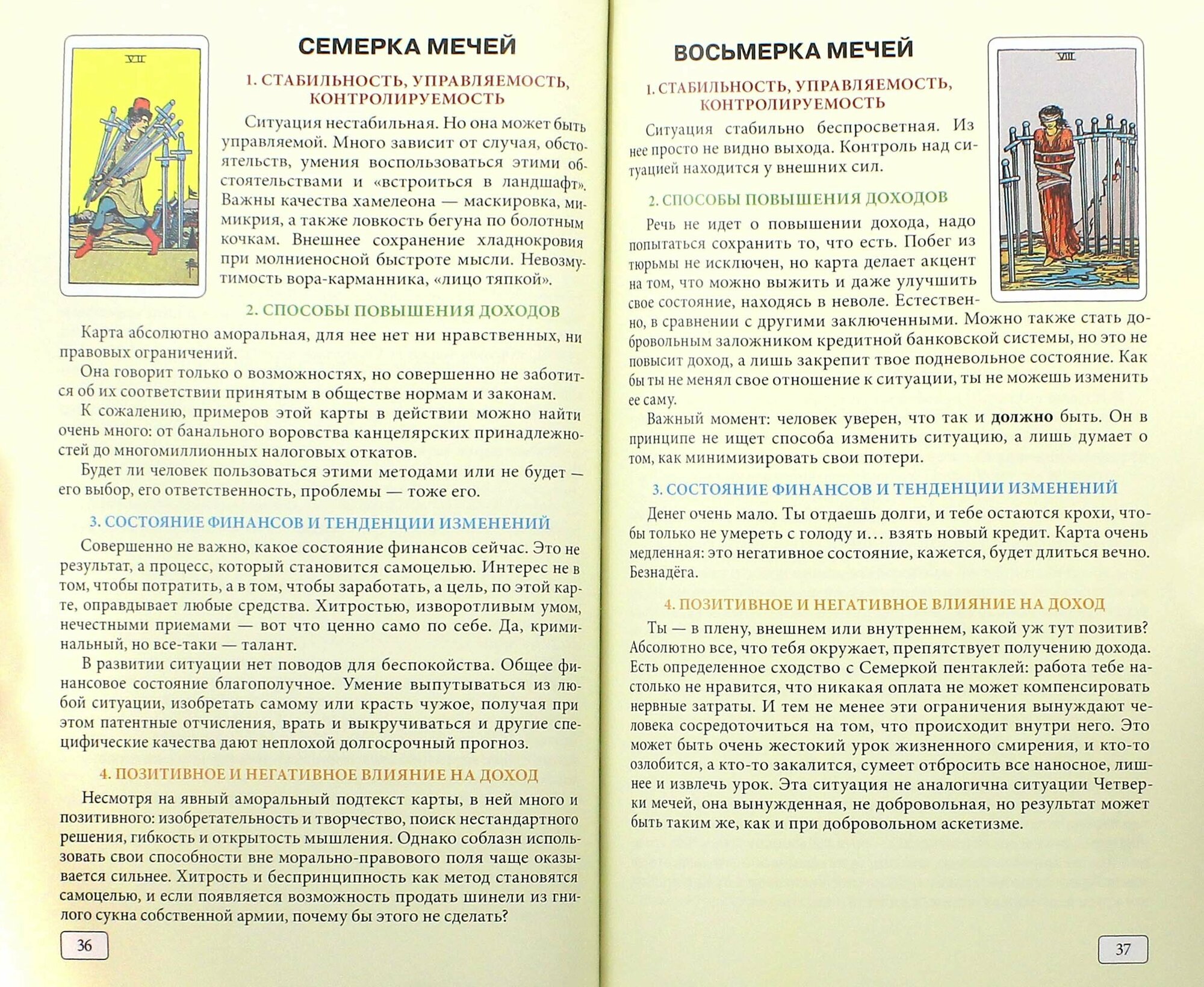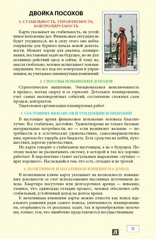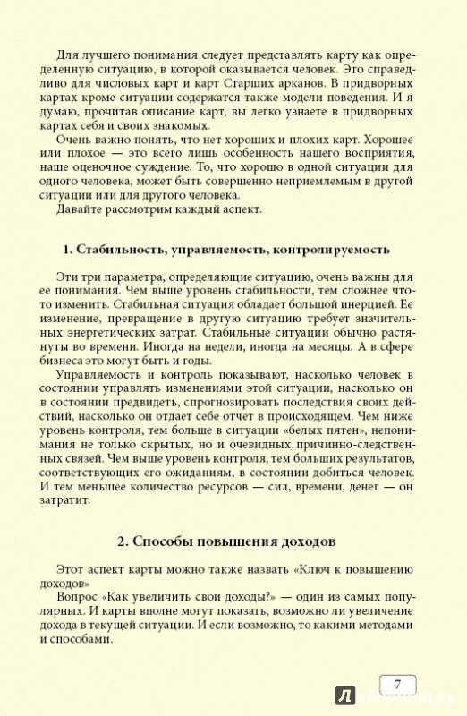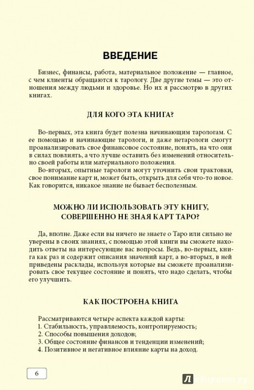 Сергей Савченко отличается систематическим подходом к изучению Таро. Как в курсах, так и в книге описание доступное и понятное. Информация структурирована, ничего лишнего, все четко по делу. Даны подробные описания карт в теме бизнеса и финансов, примеры раскладов и в конце краткие значения сведены в таблицы.