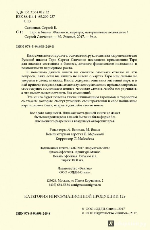 Книга опытного таролога, основателя, руководителя и преподавателя Русской школы Таро Сергея Савченко посвящена применению Таро для анализа состояния в бизнесе, личного финансового положения и возможности карьерного роста.