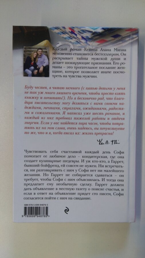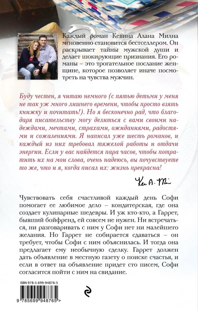 Чувствовать себя счастливой каждый день Софи помогает ее любимое дело - кондитерская, где она создает кулинарные шедевры. И уж кто-кто, а Гаррет, бывший бойфренд, ей совсем не нужен. Ни встречаться, ни разговаривать с ним у Софи нет ни малейшего желания. Но Гаррет не собирается сдаваться - он требует, чтобы Софи с ним объяснилась. И тогда она предлагает ему необычную сделку. Гаррет должен дать объявление в местную газету о поиске счастья, и, если в ответ на объявление придет сто писем, Софи согласится пойти с ним на свидание.