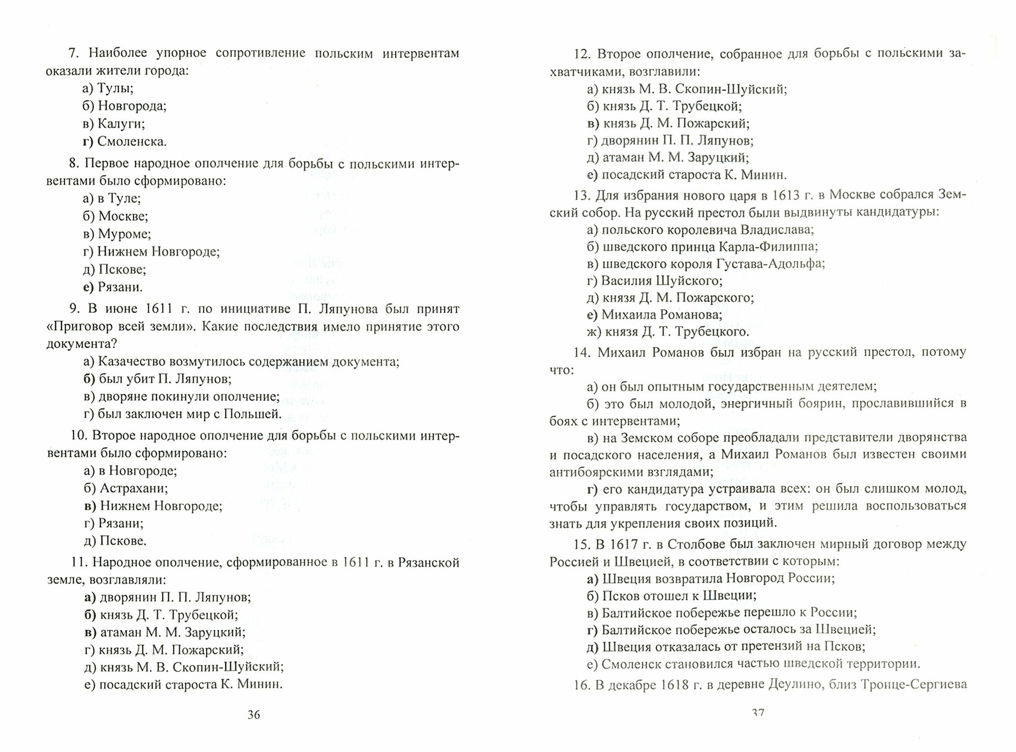 На стр.23 в теме «Движение И.И. Болотникова. Деятельность В.И. Шуйского. «Тушинский вор» в тестовых заданиях дается вопрос 5 следующего содержания: «Патриарх Гермоген писал о тех, кто обещал своим сторонникам «давати боярство, и воеводство, и окольничество, и дьячество… и жены их и вотчины, и поместья». Кто давал такие обещания?» Предлагаются три варианта ответов – самозванцы, поляки, Болотников и его сторонники. В качестве правильного выделен ответ «самозванцы», хотя Патриарх Гермоген цитирует прелестные письма И.И. Болотникова и правильным ответом на этот вопрос был бы ответ «И.И. Болотников и его сторонники».