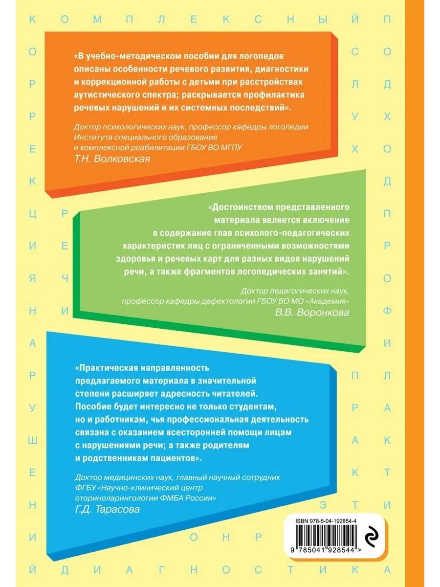 В пособии учтены прогрессивные тенденции современного развития отечественной и зарубежной логопедии, в том числе мультидисциплинарности, интегрированное™ знаний, ориентированности на формирование широких профессиональных компетенций. Особое внимание уделяется раннему и своевременному выявлению речевой патологии у лиц разных возрастных категорий, необходимости объективной оценки состояния их речи и комплексной коррекционной помощи детям, подросткам и взрослым. Содержание данного учебного пособия соответствует Федеральному закону "Об образовании в Российской Федерации", Федеральным государственным образовательным стандартам (дошкольного, начального, основного и высшего образования), модульным программам курса логопедии и смежных дисциплин медико-психолого-педагогического цикла. Все материалы прошли длительную и успешную апробацию и внедрены в медико-педагогическую практику.