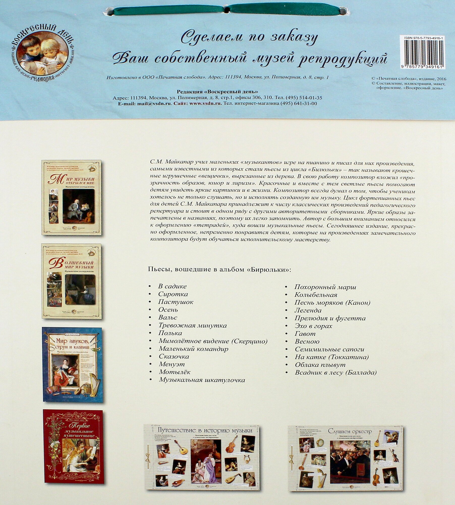 С. М. Майкапар учил маленьких "музыкантов" игре на пианино и писал для них произведения, самыми известными из которых стали пьесы из цикла "Бирюльки" - так называют крошечные игрушечные "вещички", вырезанные из дерева. В свою работу композитор вложил "прозрачность образов, юмор и лиризм". Красочные и вместе с тем светлые пьесы помогают детям увидеть яркие картинки и в жизни. Композитор всегда думал о том, чтобы ученикам хотелось не только слушать, но и исполнять созданную им музыку. Цикл фортепианных пьес для детей С. М. Майкапара принадлежит к числу классических произведений педагогического репертуара и стоит в одном ряду с другими авторитетными сборниками. Яркие образы запечатлены в названиях, поэтому их легко запомнить. Автор с большим вниманием относился к оформлению "тетрадей", куда вошли музыкальные пьесы. Сегодняшнее издание, прекрасно оформленное, непременно понравится детям, которые на произведениях замечательного композитора будут обучаться исполнительскому мастерству.