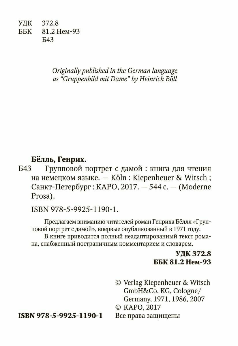Сервис сравнения цен СкидкаГИД предлагает сравнить цены на товар «Книга: Групповой портрет с дамой = Gruppenbild Mit Dame: книга для чтения на немецком языке (Генрих Бёлль); КАРО, 2017»