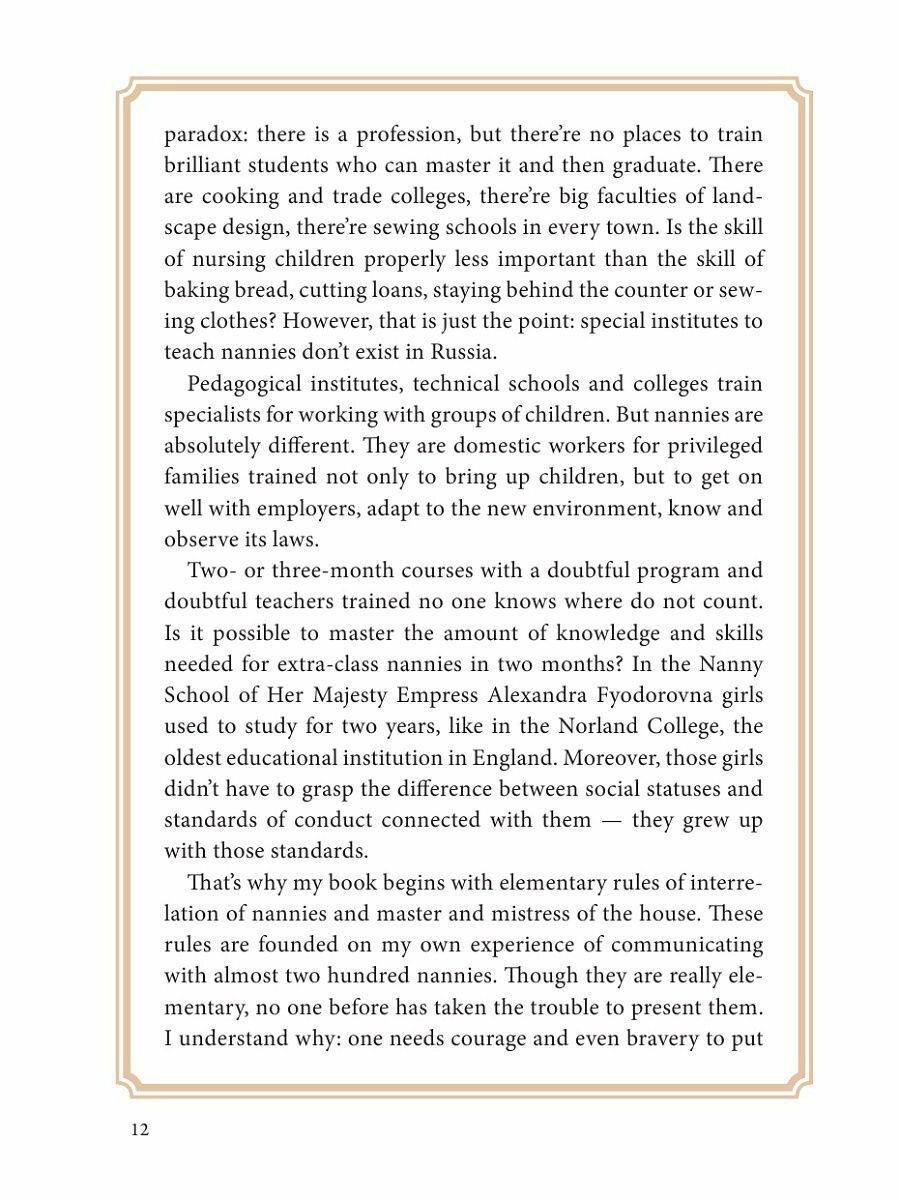 В России существует серьезная проблема - нет такого высшего учебного заведения, где обучали бы столь важному делу, как воспитание нового поколения. В педагогических институтах, техникумах и колледжах готовят специалистов для работы с детскими коллективами. Но няня - это нечто совсем другое. Не многие задумываются об этом, но почти каждый сталкивается с этим по ходу жизни. Книга, которую вы держите в руках написана отечественным автором и основана на отечественных материалах. Она начинается с элементарных правил взаимоотношений няни и хозяев, которые выведены автором на опыте общения почти с 200 нянь. "Идеальная няня" написана для тех, кто выбирает профессию няни не "по жестокой воле обстоятельств", а по призванию, для кого это не способ переждать худые времена или ступенька "карьерной" лестницы, - те не раз поблагодарят автора за учебник профессии и жизни.