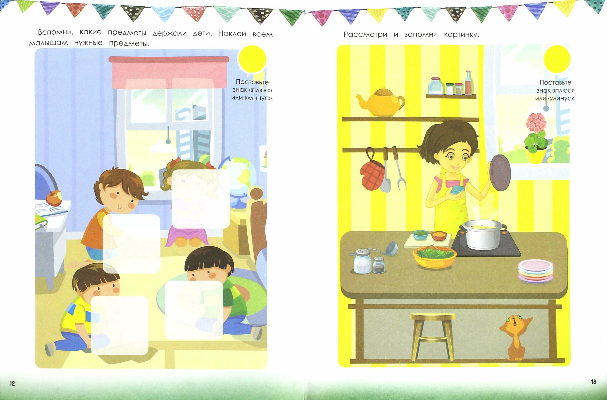 В книжке 8 тестовых заданий с наклейками (на мой взгляд маловато), повторно сделать задание или переделать не получится, так как наклейки не многоразовые. Каждое задание включает в себя одну страничку, которую ребенок рассматривает и запоминает расположение предметов на ней и вторую страничку, где предметы отсутствуют, и ребенок должен их наклеить на нужные места. Каждое правильно выполненное задание отмечается плюсом и в книге даны критерии оценки.