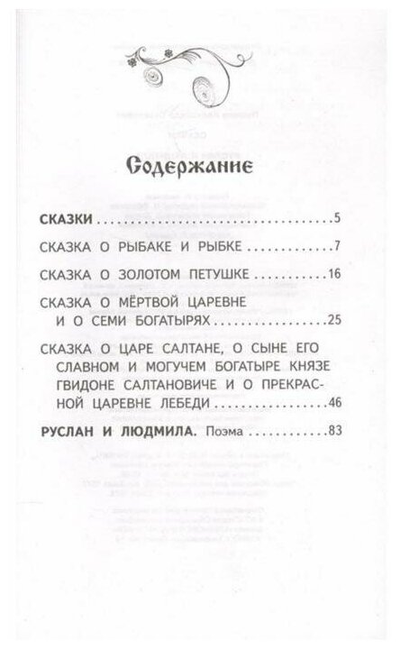 Сказки. Руслан и Людмила ? Сказки великого русского поэта А. С. Пушкина (1799–1837) известны нам с раннего детства. В сборник вошли "Сказка о рыбаке и рыбке" (1833), "Сказка о золотом петушке" (1834), "Сказка о царе Салтане" (1831), "Сказка о мёртвой царевне и семи богатырях" (1833), а также отрывок из поэмы "Руслан и Людмила" (1817–1820).Поэму "Руслан и Людмила" поэт начал писать ещё в лицее. Князь Владимир Красное Солнышко празднует свадьбу своей младшей дочери Людмилы с князем Русланом. И лишь три гостя не рады счастью молодых, это три соперника Руслана: Рогдай, Фарлаф и Ратмир. Неожиданно Людмила исчезает. Разгневанный великий князь приказывает молодым витязям отправиться на поиски Людмилы.