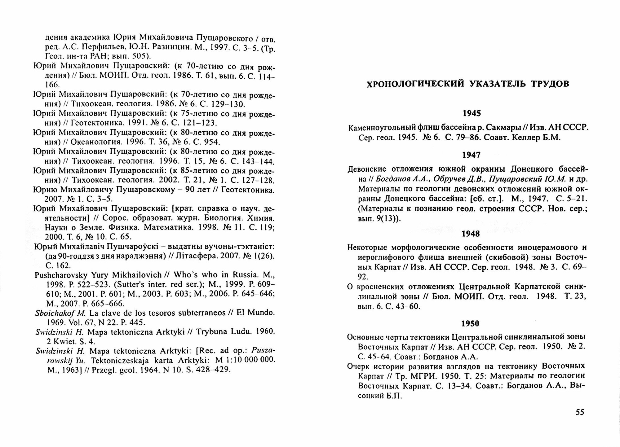Выпуск посвящен выдающемуся российскому ученому академику Ю.М. Пущаровскому - автору трудов по региональной геологии и тектонике Евразии, строению и структурному развитию Арктики, Тихого океана и его обрамления, Атлантики и Индийского океана, а также по теоретической тектонике и нелинейной геодинамике. Содержит описание жизненного и творческого пути ученого, литературу о нем, хронологический указатель трудов.