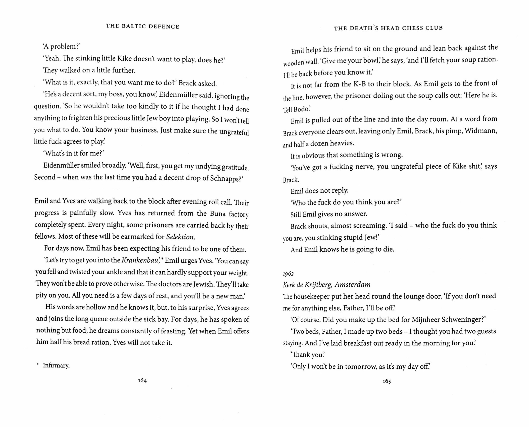 Эта история о человеке по имени Эмиль Клемент, узнике с номером 163291, который оказывается втянут в шахматный турнир с СС и даже Гестапо. Его победа или поражение становятся важными для многих. Он становится в самом страшном месте - Освенциме. Через 20 лет у него возникает неожиданная дружба с офицером Паулем Мейснером из СС. Автор использует ужасы Холокоста как фон для своего первого романа. Это настоящая трагедия, которая шокирует своей жестокостью. Если автор обладает хорошим стилем и знаниями, то тема Холокоста мощно влияет на сюжет. Доногью умело пишет - просто, понятно и увлекательно, что доступно только талантливым писателям. Он также хорошо осведомлен и делает честь сноскам. В целом, это хорошая книга, но автор мог бы достичь большего, если бы не смешивал два временных периода - события в Освенциме и через 20 лет. Это сняло часть напряжения и драмы с событий в Освенциме, перенеся их на результат шахматных партий. В то же время, переходы между временами легко читаются и не запутывают.