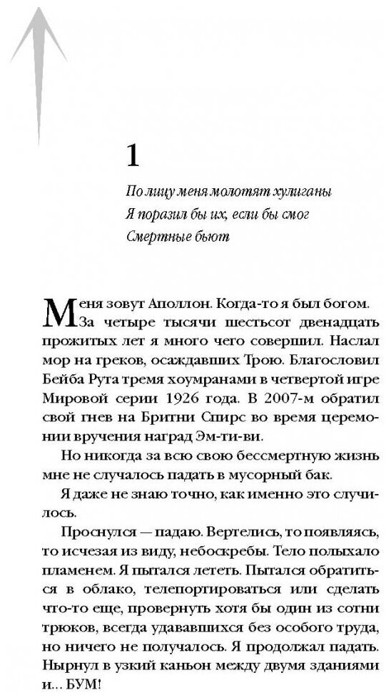 Как наказать бога? Легко! Превратить его в смертного и отнять божественную силу! После того как Аполлон разгневал своего отца Зевса, его свергли с Олимпа. Беспомощный, слабый, он оказался в Нью-Йорке в теле обыкновенного подростка. Лишенный всех сил, он должен не просто выжить в современном городе, но и выполнить волю грозного отца. Аполлону предстоит служить весьма необычной девочке по имени Мэг, которая, к слову сказать, отлично владеет мечами. Вот только за четыре тысячи лет бог солнца нажил себе немало врагов, и они спят и видят, как бы поквитаться за старые обиды. И миссия Аполлона становится практически невыполнимой. Не говоря уже о том, что древнее зло, о котором все успели забыть, кажется, проснулось... Знакомьтесь с богом-зазнайкой Аполлоном и встречайте любимых героев: Перси Джексона, Лео Вальдеса, Нико ди Анджело, кентавра Хирона и других. Потому что ОНИ ВОЗВРАЩАЮТСЯ! Старые друзья - новые приключения!