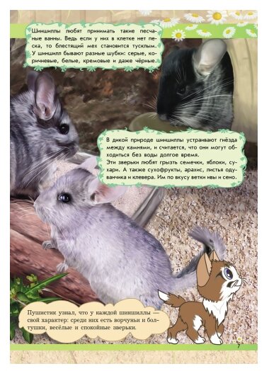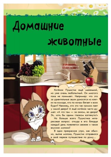 Книга яркая, качество печати отличное. Но очень мало животных: в каждом разделе представлено всего 4 вида. Например, из домашних животных - хомяк, шиншилла, собака, корова. Дикие - волк, медведь, крот, заяц. Насекомые - божья коровка, бабочка, пчела, кузнечик. Обитатели морей - дельфин, косатка, краб, акула, медуза. Зато динозавров аж 16 с такими названиями, что и сам не выговоришь, не то, что ребёнок. Один разворот - одно животное. За такие деньги хотелось бы большего разнообразия. Каждому животному дано описание простым, понятным языком: где живёт, чем питается, отличительные повадки. В целом, разочарована покупкой.