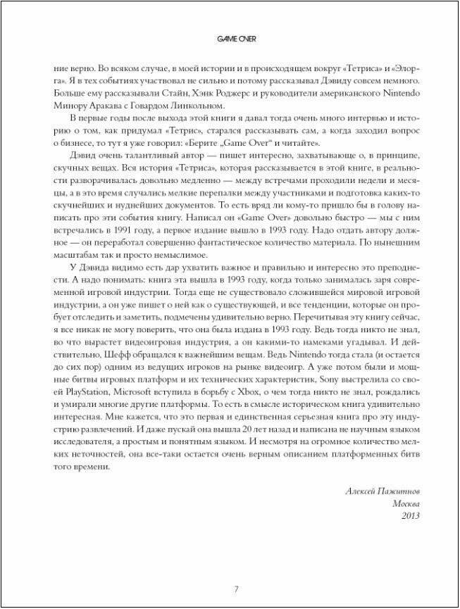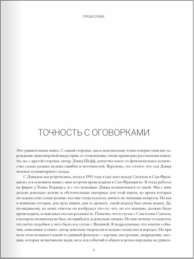 что значит то или иное предложение, понимаешь из контекста, например, в паре мест «не» значит «да». В целом книга очень познавательная и бесценная для всех интересующихся историей видеоигр. Кроме интересных фактов об играх и их создателях, в книге содержится много ценных бизнес-идей. Я уверен, что ни один из тех, кто в детстве играл в Денди, не пожалеет о прочтении этой книги.