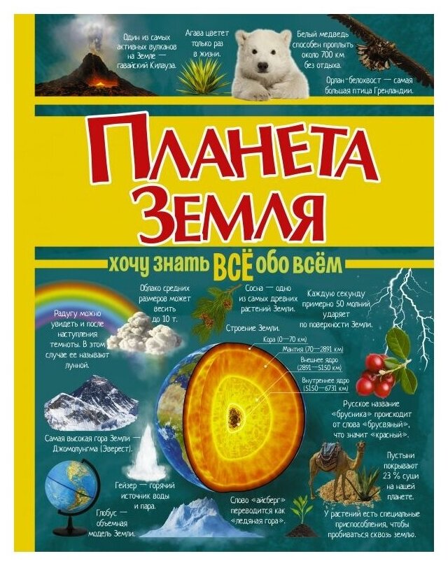 Наш родной дом — планета Земля. Но много ли мы знаем о ней? Да, Земля круглая, вертится вокруг своей оси, на ней есть континенты, моря и океаны. Однако задумывался ли ты, что находится внутри нашей планеты, отчего происходят стихийные бедствия, как вообще появилась Земля, а может, она существовала всегда? Книга, которую ты держишь в руках, поведает тебе если не абсолютно все, то очень многое о планете Земля. Ты узнаешь, чем отличается погода от климата, о необычных природных явлениях, сокровенных тайнах Мирового океана, о том, что поверхность Земли вовсе не такая ровная, какой мы ее видим на глобусе, и многом другом. Кроме того, в книге масса прекрасных иллюстраций, которые помогут лучше воспринимать новые сведения. Хочешь немедленно знать все обо всем на Земле? Тогда вперед: просто открой эту замечательную книгу и тебе гарантировано не только увлекательное чтение, но и новые знания!