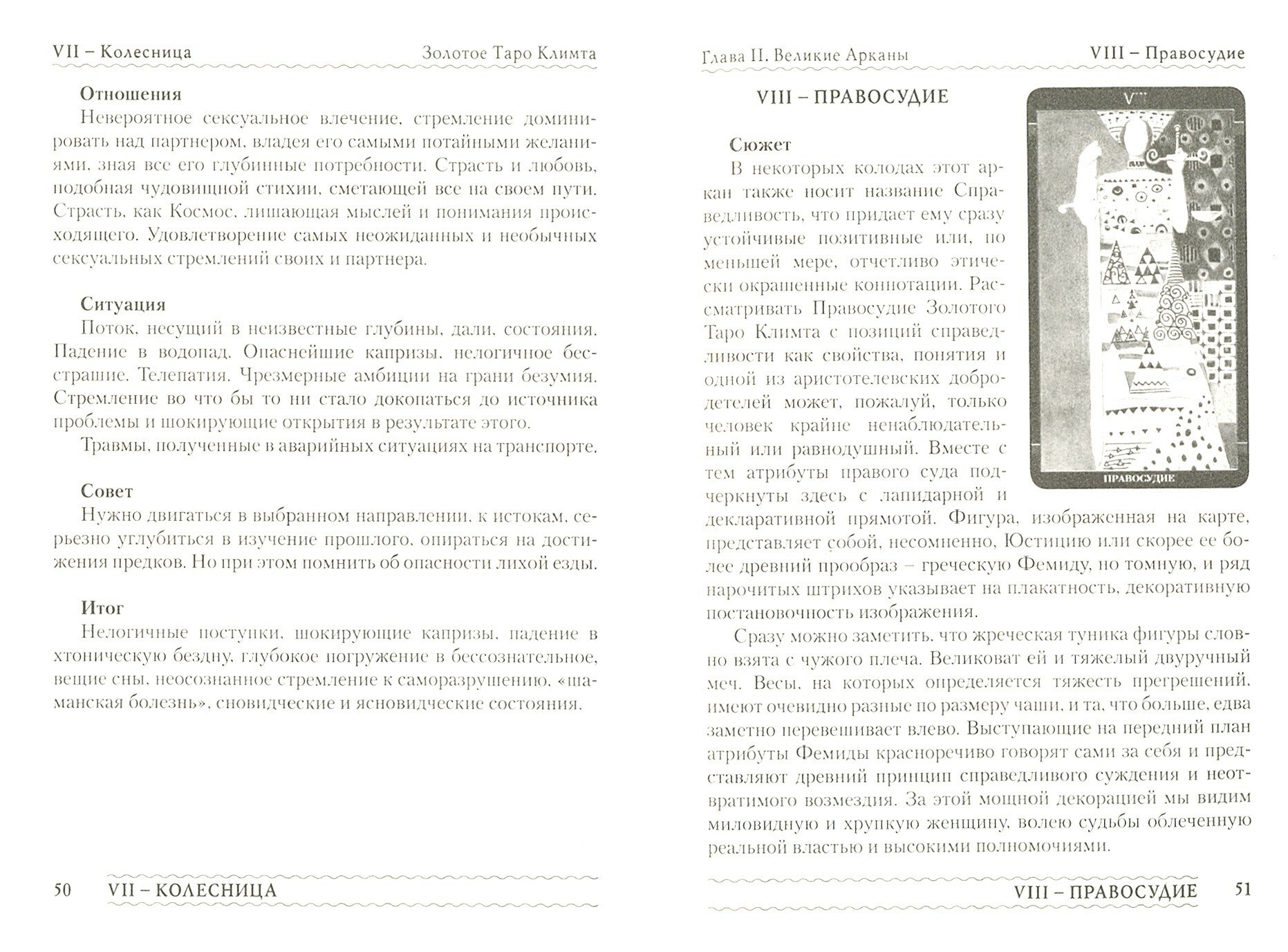 Это не просто книга по колоде замечательного художника Густава Климта, это проба работы решения серьезных вопросов психологии, вопросов сексуальных совместимостей или не совместимостей в союзе, анализа сексуальных отношений в союзе, в партнерстве, конфликтов и конфликтности с помощью колоды Таро.