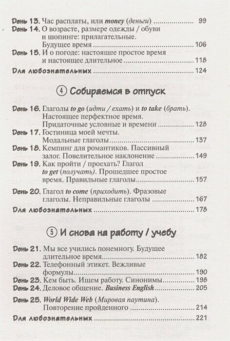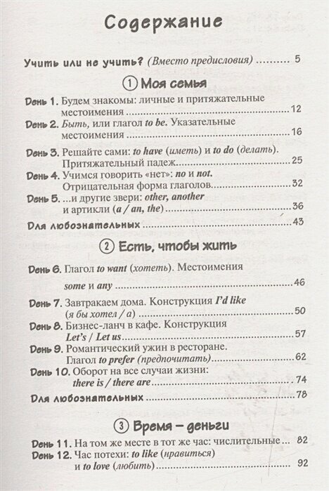 В пособии 25 уроков, распределенных по 5 тематическим блокам: "Моя семья", "Есть, чтобы жить", "Время - деньги", "Собираемся в отпуск", "И снова на работу/учебу". В занятия включены диалоги, даются небольшие словарики, грамматические комментарии. Произношение слов и выражений передано русскими буквами, что облегчает процесс обучения. К тому же можно сразу начинать отрабатывать навыки устного общения. Под рубрикой "Для любознательных" в конце тематических блоков приводятся сведения лингвистического и страноведческого характера.