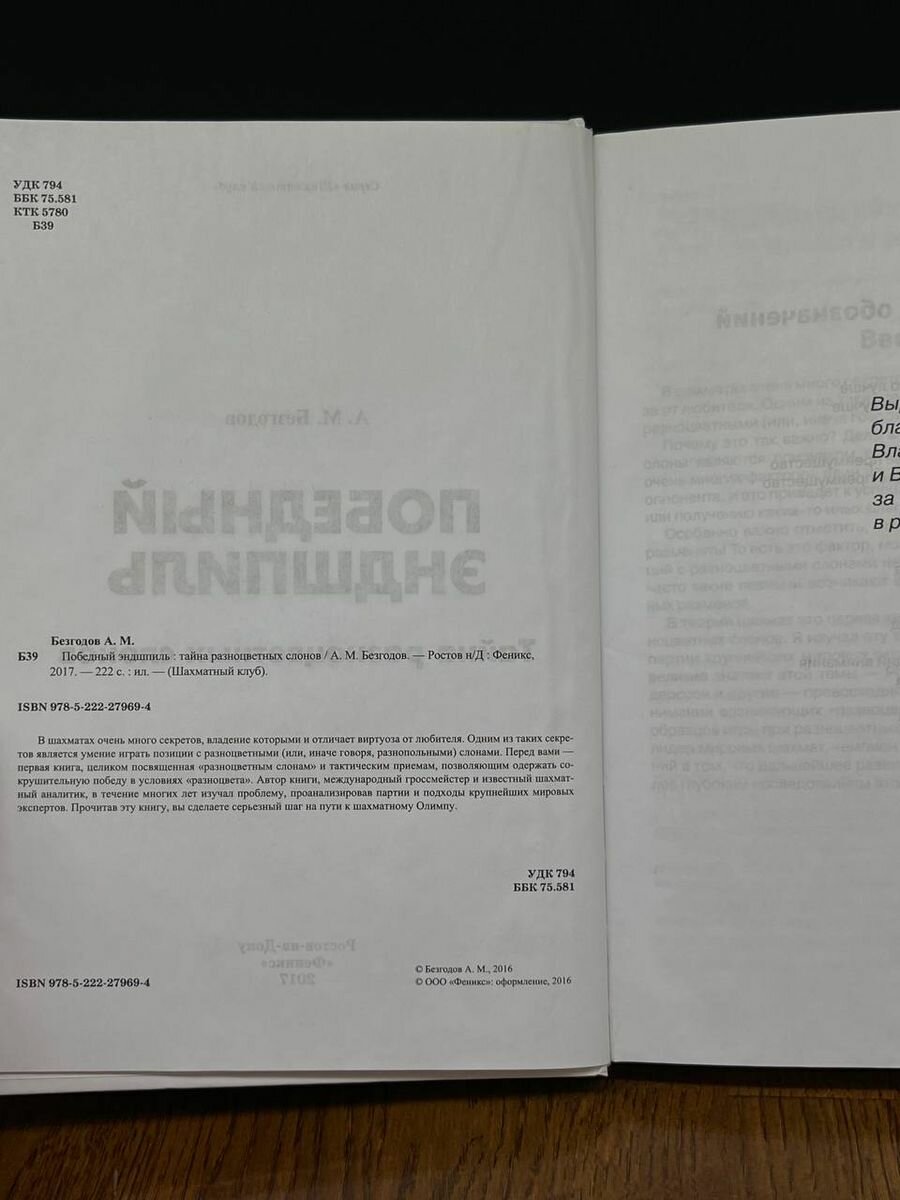 Книга А.М. Безгодова "Победный эндшпиль. Тайна разноцветных слонов" предназначена для тех, кто уже освоил мир шахмат. Новичкам будет сложно в этом разобраться. В книге даны разыгранные когда-либо шахматные "разноцветные" позиции. Эту тему автор изучал в течение нескольких лет, анализируя партии крупнейших мировых экспертов и теперь делится с любителями шахмат своими наблюдениями. Даны позиции, кто с кем играл, где и в каком году, а затем комментарии автора. Книга в переплёте, страницы белые, тонкие.