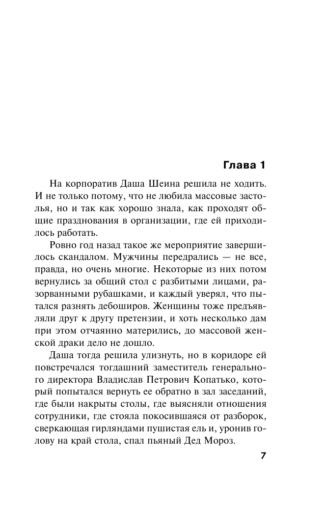 Дашу Шеину завалили на защите диссертации и не взяли в институт истории, поэтому ей пришлось устроиться на скучную работу в управляющую компанию. Тридцать первого декабря директор Владислав Копатько потребовал подготовить срочный отчет и привезти в его загородный коттедж. Даша заподозрила неладное, но выхода у нее не было, и она отправилась к нему домой. Как она и ожидала, отчет оказался не нужен, Копатько начал приставать к Даше. Он был пьян, но ей удалось освободиться и сбежать, ударив шефа подсвечником. О его самочувствии Даша не беспокоилась, ведь она хрупкая девушка и удар не причинил начальнику особого вреда. Но на следующий день к Даше пришла полиция с шокирующим сообщением: Копатько убили и она последняя, кто видел его живым…
