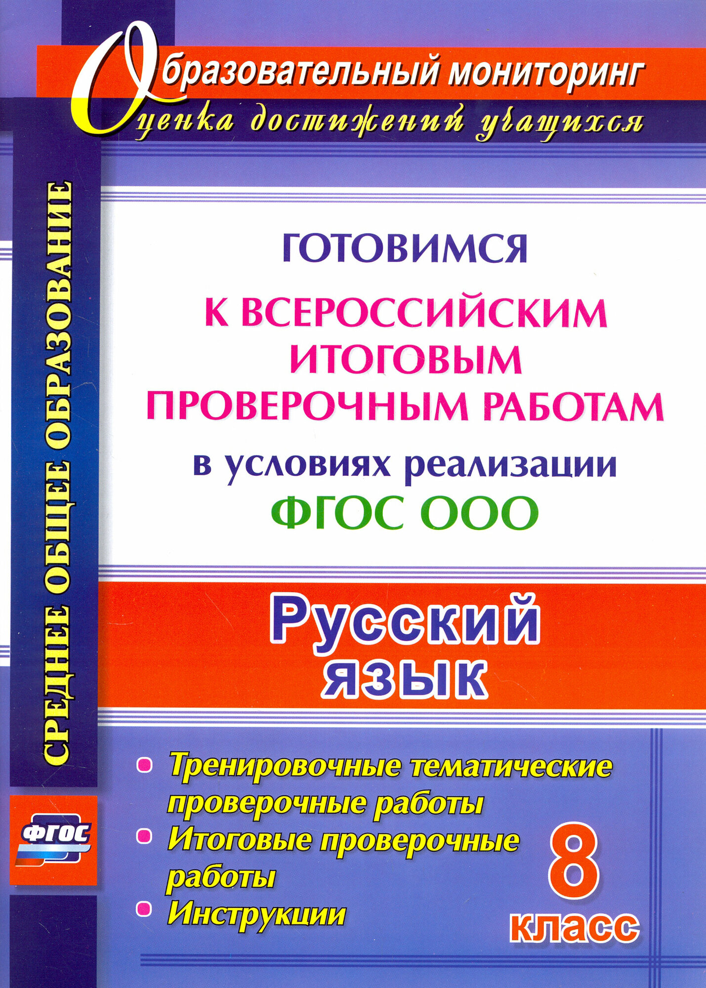 Всероссийская итоговая проверочная работа, которую напишут восьмиклассники, будет включать задания по русскому языку. Практика системы подготовки к проведению такой формы оценки качества образования отвечает требованиям ФГОС ООО и предполагает формирование диагностического ресурса, который позволит школьникам привыкнуть к экзаменам, попробовать свои возможности в регулярном выполнении контрольных работ, оценить уровень реальных знаний и умений, отследить успехи и неудачи. В пособии представлены примерные итоговые проверочные работы по русскому языку и тренировочные тематические проверочные работы, составленные с учетом типичных ошибок и возникающих при изучении определенных тем трудностей, инструкции по выполнению.