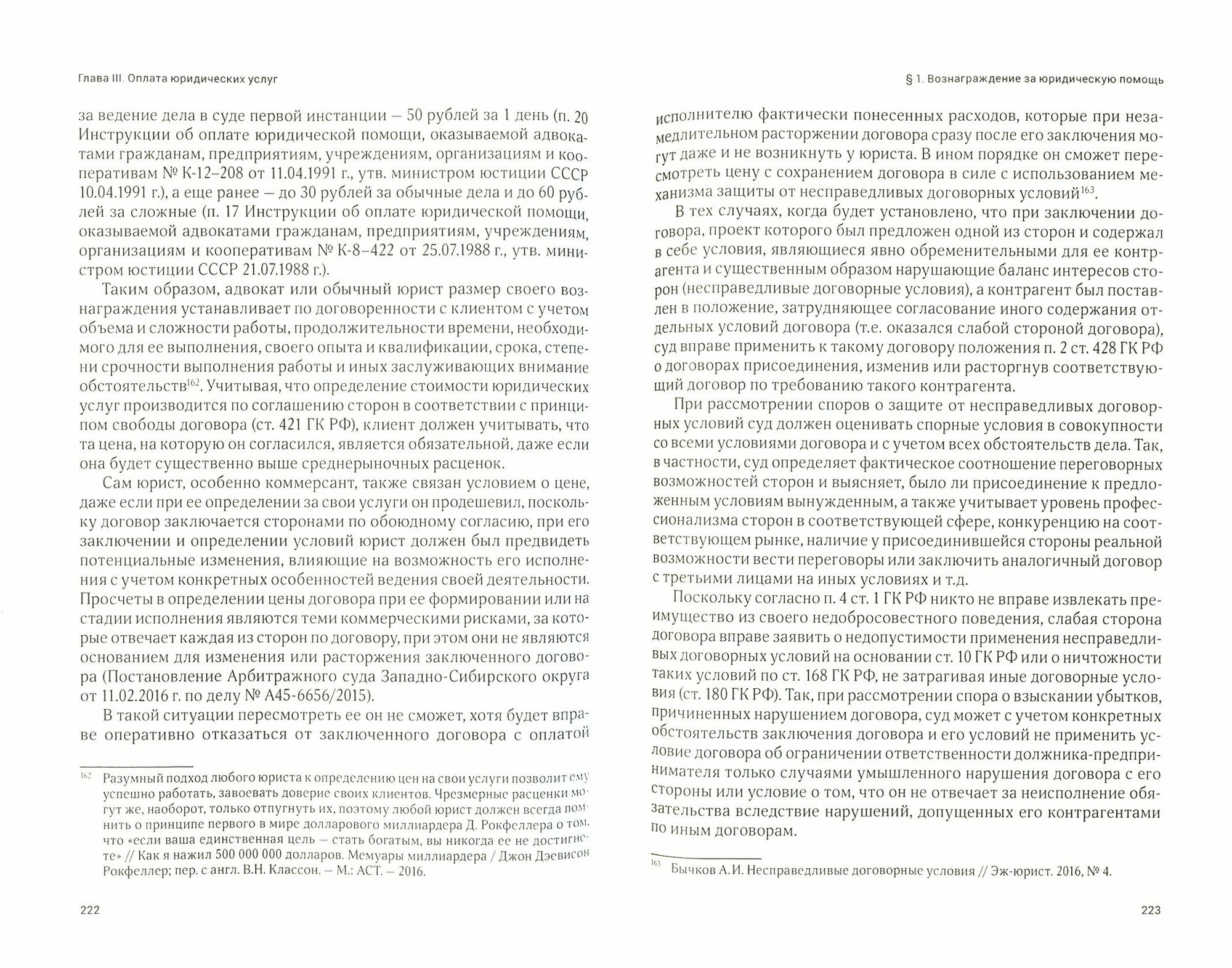На основе анализа и обобщения сложившейся судебной практики в работе исследуются спорные вопросы оплаты юридических услуг (плата за результат, за отказ от договора, оплата в форме уступки клиентом части своих требований, взимание платы за навязываемую нотариусом правовую и техническую работу, выплата вознаграждения за счет бюджета и предоставление бесплатной юридической помощи), вопросы ответственности за предоставление некачественной юридической помощи, а также защиты самими юристами своих прав. В книге в сравнительном аспекте исследуется также судебная практика Абхазии, Беларуси, Болгарии, Донецкой и Луганской народных республик, Казахстана, Киргизии, Приднестровья, Сербии, Узбекистана и Южной Осетии.