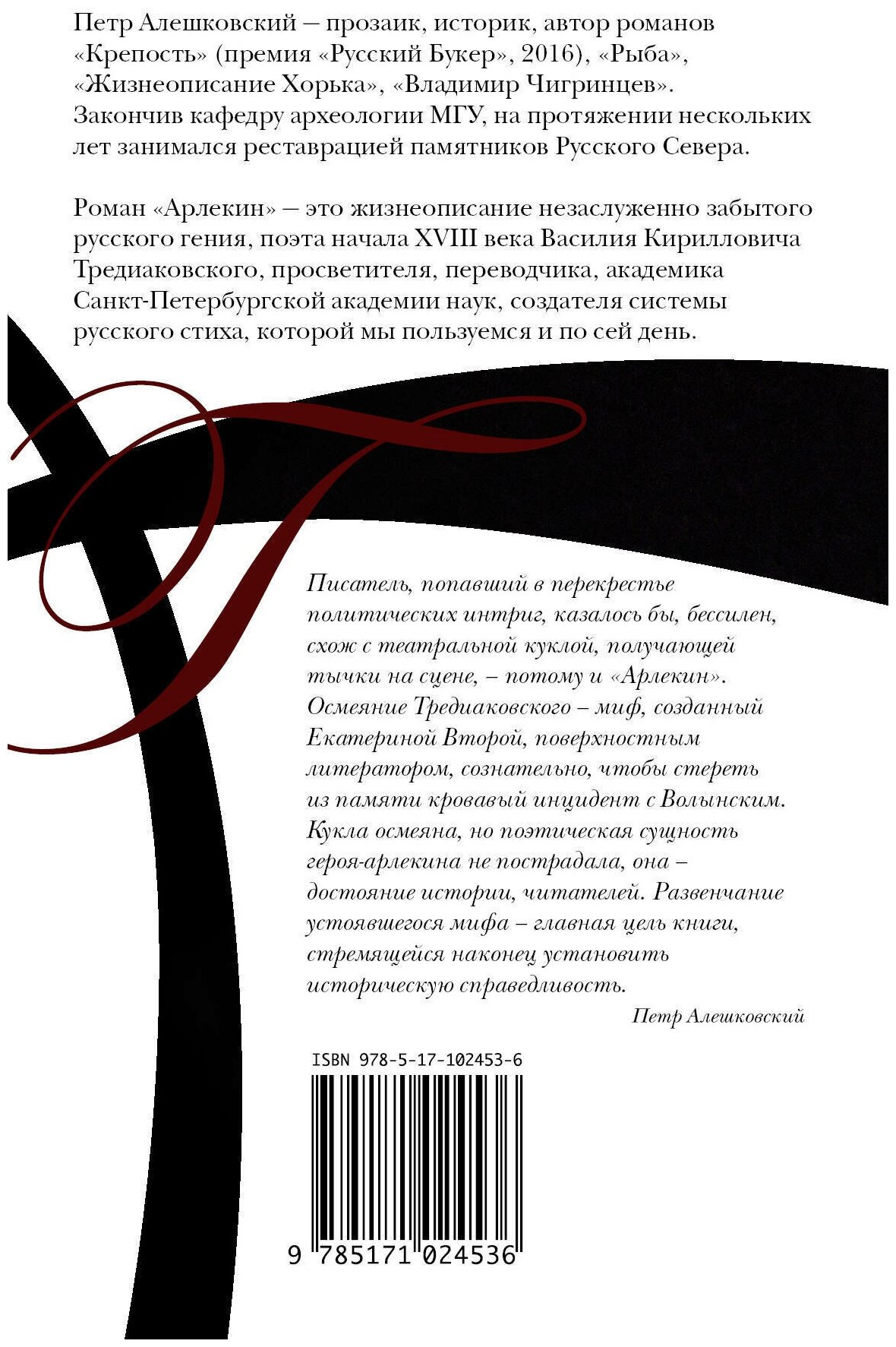 Роман "Арлекин" - это жизнеописание незаслуженно забытого русского гения, поэта начала XVIII века Василия Кирилловича Тредиаковского, просветителя, переводчика, академика Санкт-Петербургской академии наук, создателя системы русского стиха, которой мы пользуемся и по сей день.