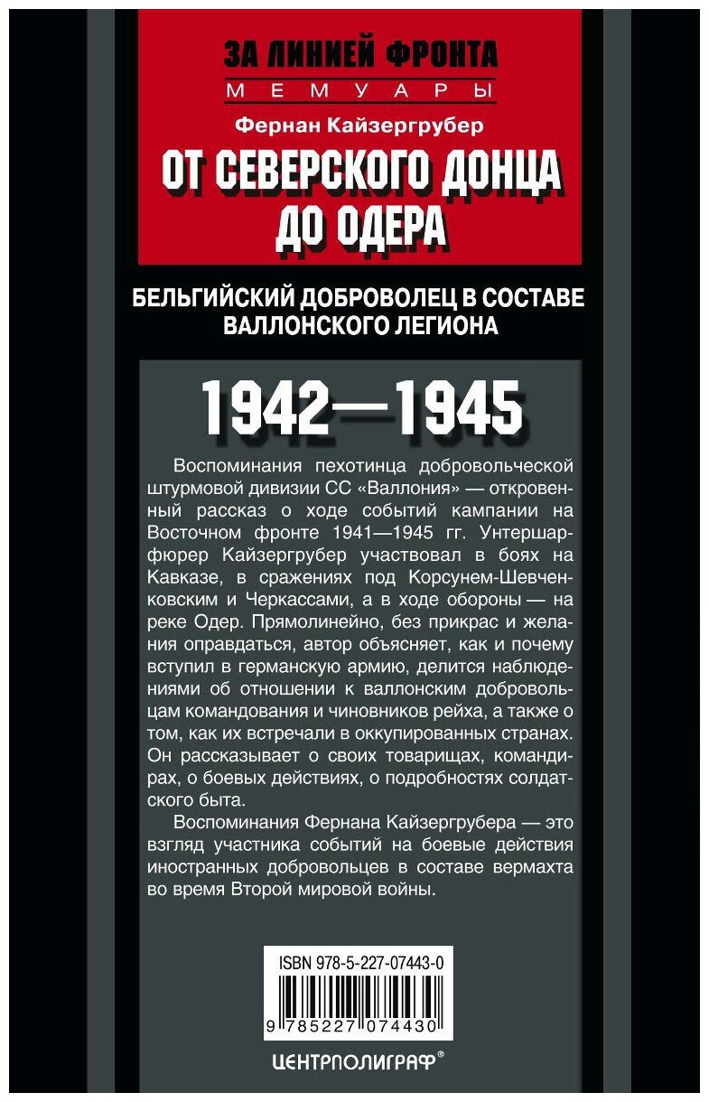 Воспоминания пехотинца добровольческой штурмовой дивизии СС "Валлония" - откровенный рассказ о ходе событий кампании на Восточном фронте 1941-1945 гг. Унтершарфюрер Кайзергрубер участвовал в боях на Кавказе, в сражениях под КорсунемШевченковским и Черкассами, а в ходе обороны - на реке Одер. Прямолинейно, без прикрас и желания оправдаться, автор объясняет, как и почему вступил в германскую армию, делится наблюдениями об отношении к валлонским добровольцам командования и чиновников рейха, а также о том, как их встречали в оккупированных странах. Он рассказывает о своих товарищах, командирах, о боевых действиях, о подробностях солдатского быта.