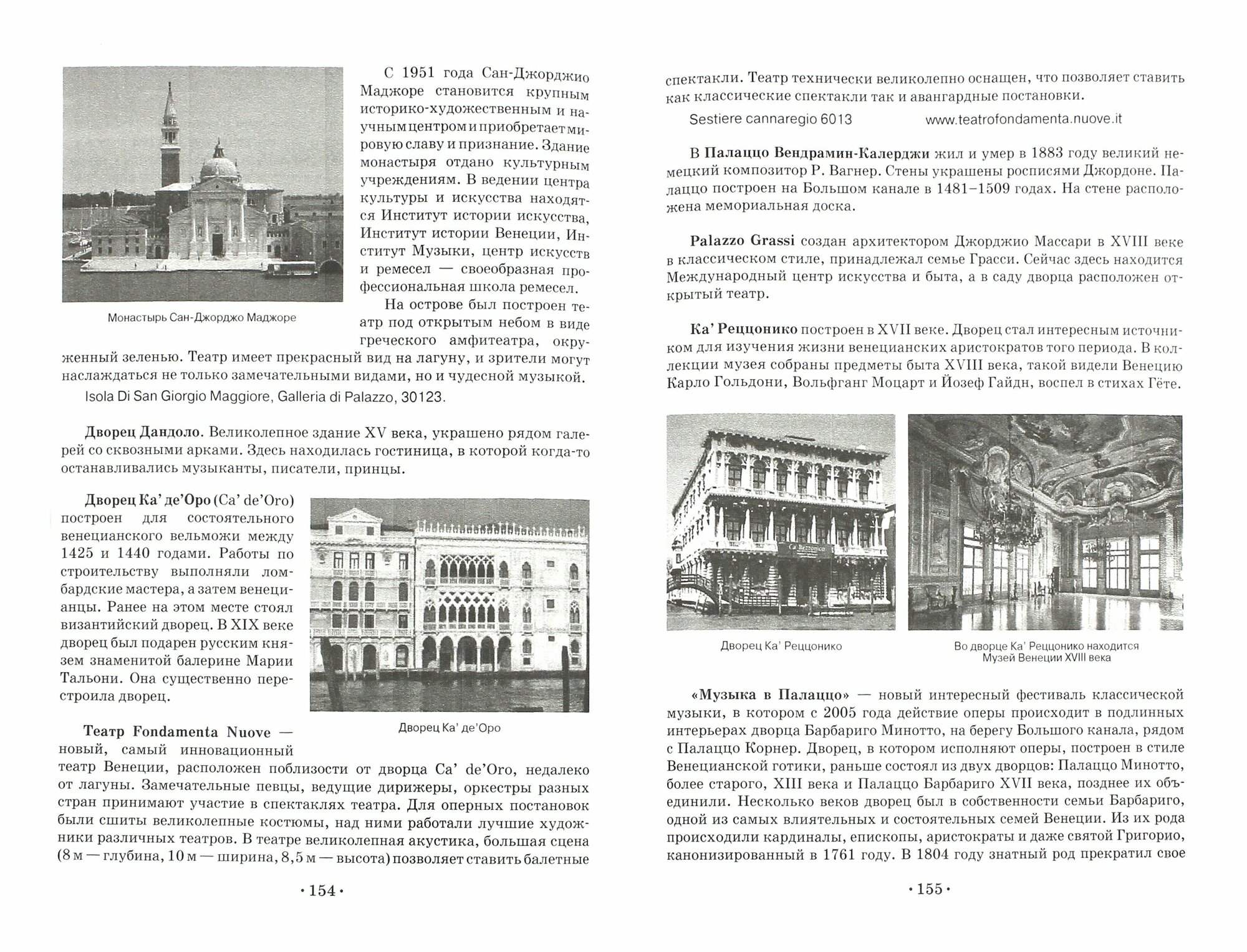 Музыкальный путеводитель включает путешествие по 14 городам Италии, краткую информацию о музыкальных местах городов, о композиторах, исполнителях, которые жили и творили в этих городах, о музыкальных событиях, происшедших в конкретном городе, о конкурсах и фестивалях, проходящих в них, о народных костюмированных праздниках и карнавалах в которых могут принять участие все желающие туристы, побывать на спектаклях лучших оперных театров мира.