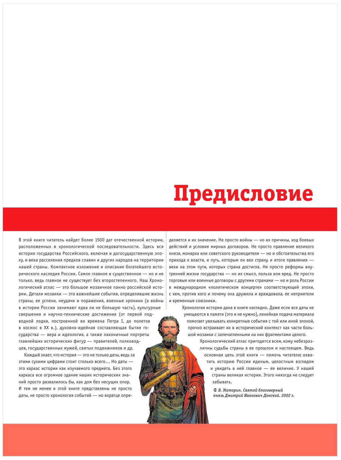 Этот атлас – путеводитель по истории России с древних времен до наших дней. Хронологический атлас богат красочными иллюстрации и емкими текстами. Его главной особенностью является "лента времени" - изложение важнейших событий истории государства Российского в хронологическом порядке. Цель этой книги - помочь читателю охватить историю России единым, целостным взглядом и увидеть в ней главное - ее величие.