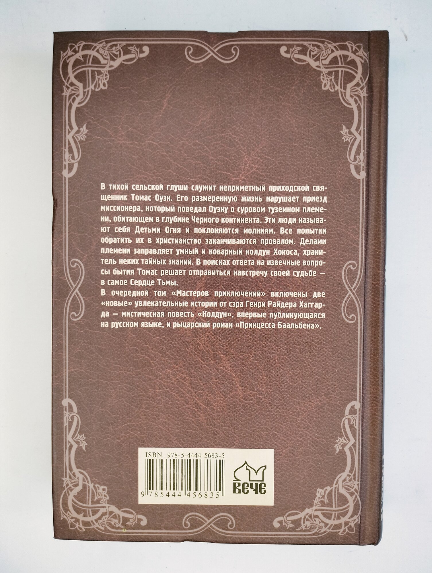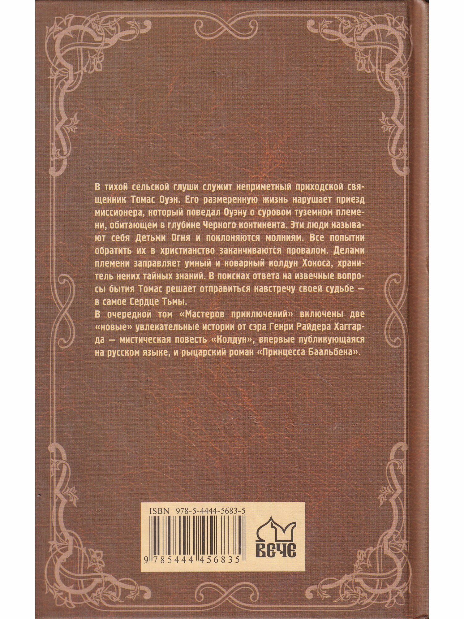 В тихой сельской глуши служит неприметный приходской священник Томас Оуэн. Его размеренную жизнь нарушает приезд миссионера, который поведал Оуэну о суровом туземном племени, обитающем в глубине Черного континента. Эти люди называют себя Детьми Огня и поклоняются молниям. Все попытки обратить их в христианство заканчиваются провалом. Делами племени заправляет умный и коварный колдун Хокоса, хранитель неких тайных знаний. В поисках ответа на извечные вопросы бытия Томас решает отправиться навстречу своей судьбе - в самое Сердце Тьмы. В очередной том "Мастеров приключений" включены две "новые" увлекательные истории от сэра Генри Райдера Хаггарда - мистическая повесть "Колдун", впервые публикующаяся на русском языке, и рыцарский роман "Принцесса Баальбека".