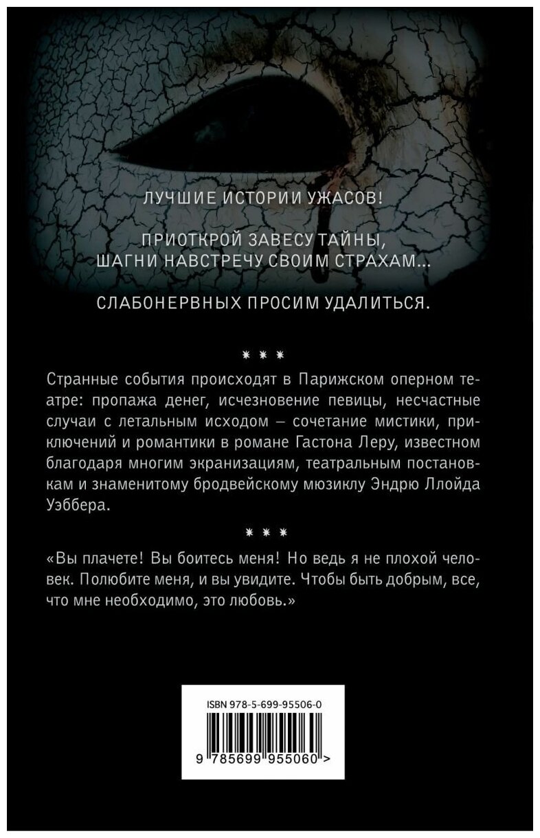 Странные события происходят в Парижском оперном театре: пропажа денег, исчезновение певицы, несчастные случаи с летальным исходом - сочетание мистики, приключений и романтики в романе Гастона Леру, известном благодаря многим экранизациям, театральным постановкам и знаменитому бродвейскому мюзиклу Эндрю Ллойда Уэббера.