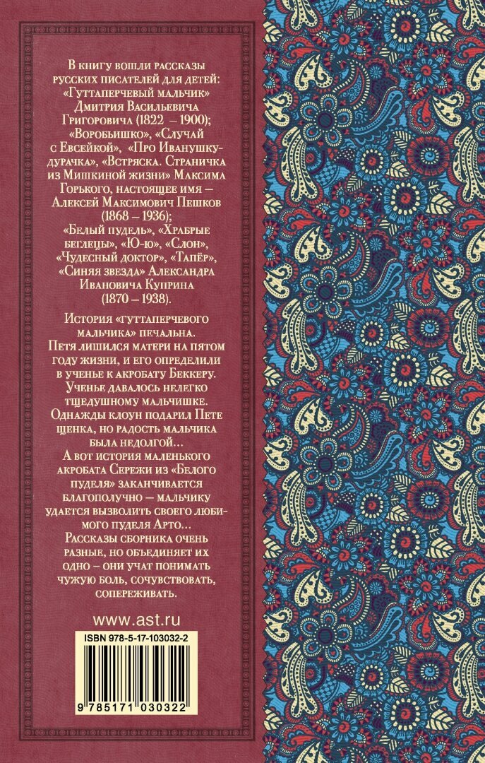 В книгу вошли рассказы русских писателей для детей: "Гуттаперчевый мальчик" Дмитрия Васильевича Григоровича (1822 - 1900); "Воробьишко", "Случай с Евсейкой", "Про Иванушку-дурачка", "Встряска. Страничка из Мишкиной жизни" Максима Горького, настоящее имя - Алексей Максимович Пешков (1868 - 1936); "Белый пудель", "Храбрые беглецы", "Ю-ю", "Слон", "Чудесный доктор", "Тапёр", "Синяя звезда" Александра Ивановича Куприна (1870 - 1938).