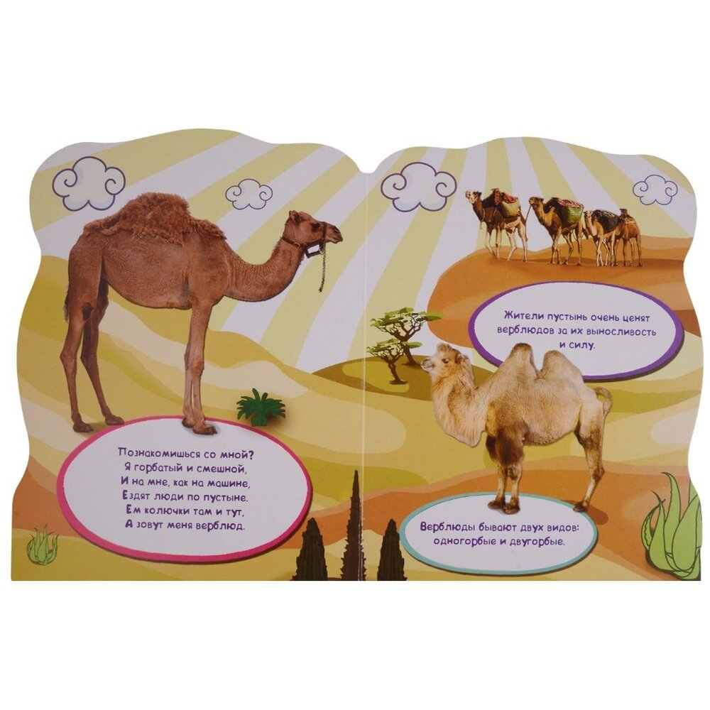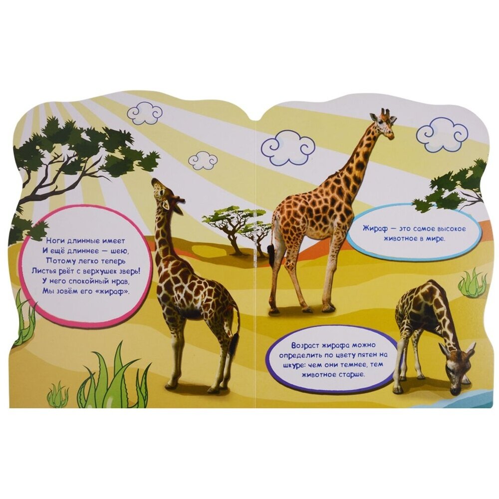 Два плюса этой книги для меня - большой формат (А4) и фотографии животных, вместо привычных рисунков. Но эти фотографии руками плохого мастера фотошопа размещены на странном каком-то как раз-таки нарисованном фоне. Одно животное - один разворот. Стихотворение и пара интересных фактов. Большой вопрос у меня к авторам - зачем давать книге название "Дикие животные" и не помещать там обыкновенного лося или медведя. Ну назовите её "Животные жарких стран" или ещё как-нибудь, чтобы максимально отразить содержание. А то "Дикие животные" по версии издательства Проф-пресс - это лев, жираф, носорог, зебра и верблюд. С дикостью их, безусловно, не поспорить, но ожидала я совсем другую подборку, поближе к родной тайге что ли...