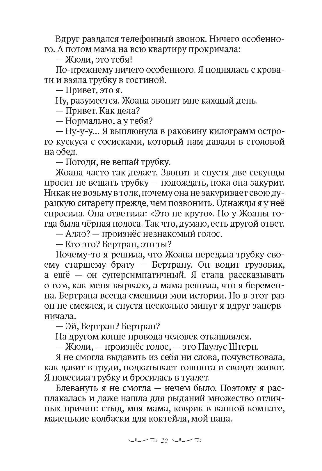 Неплохая книга, даже нашла в героине какие-то свои черты: ботаник в очках, который в школе не умел одеваться и не интересовался мальчиками )) имена только женские все почему-то на букву "Ж", из-за чего было сложно их запоминать, и про периодическое рукоприкладство родителей было неприятно читать. Не знаю, может, у французов это в порядке вещей. А так, интересная книга о том, что может быть в голове у подростка.