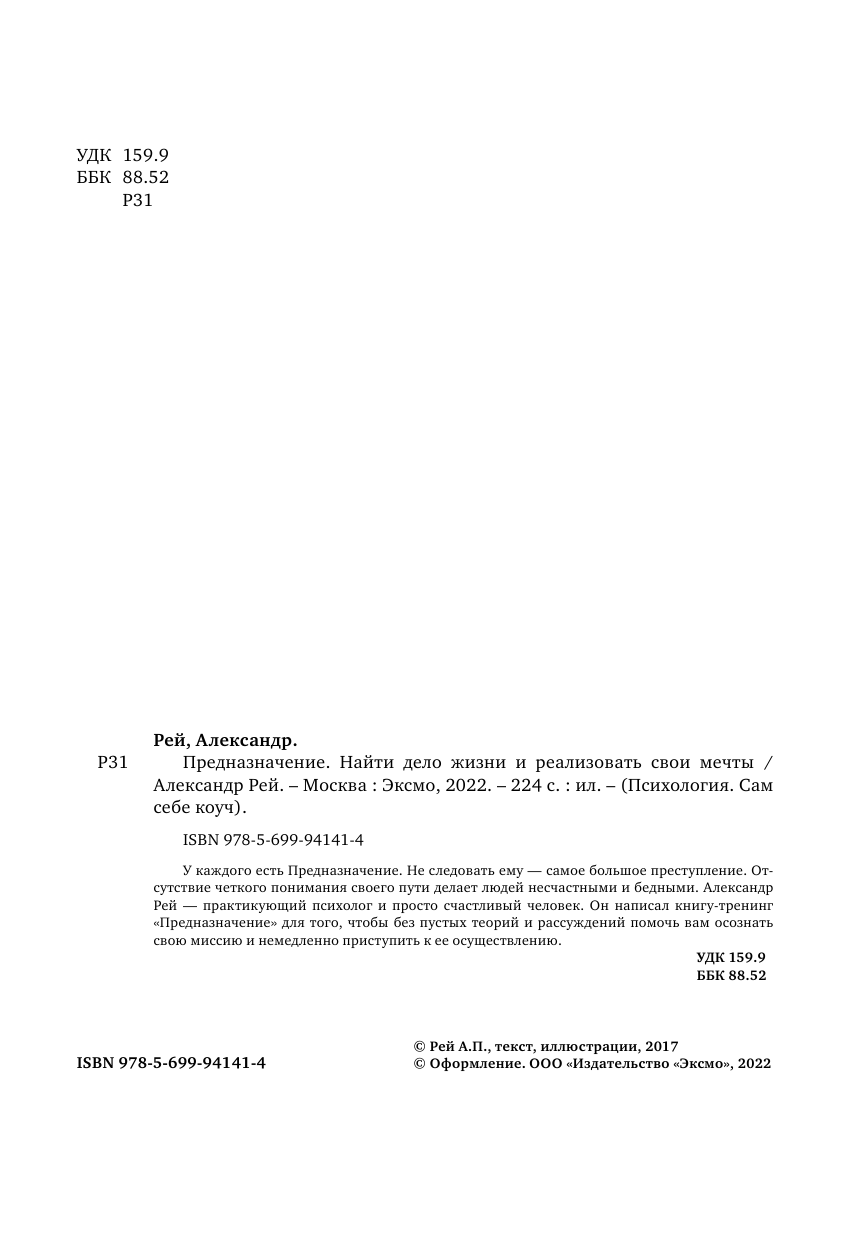 Предназначение. Найти дело жизни и реализовать свои мечты (Александр Рей); Эксмо, 2017