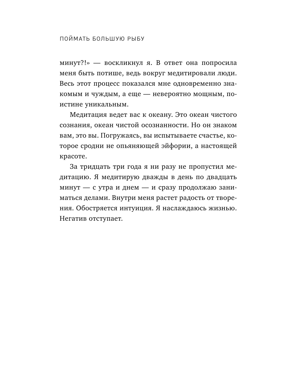 Текст этой книги обладает магическим свойством: он создает иллюзию присутствия в голове великого режиссера. Вместе с Дэвидом Линчем мы погружаемся в пучину творческого поиска, постигаем принципы трансцендентальной медитации, учимся управлять внутренней энергией и пытаемся поймать свою большую рыбу. Эта книга, ставшая бестселлером на Западе, - уникальный источник вдохновения для всех, кто желает развивать творческие способности. Она позволяет увидеть то, что раньше оставалось невидимым, услышать то, что всегда находилось за гранью слышимого, открыть дверь, о существовании которой вы даже не подозревали.