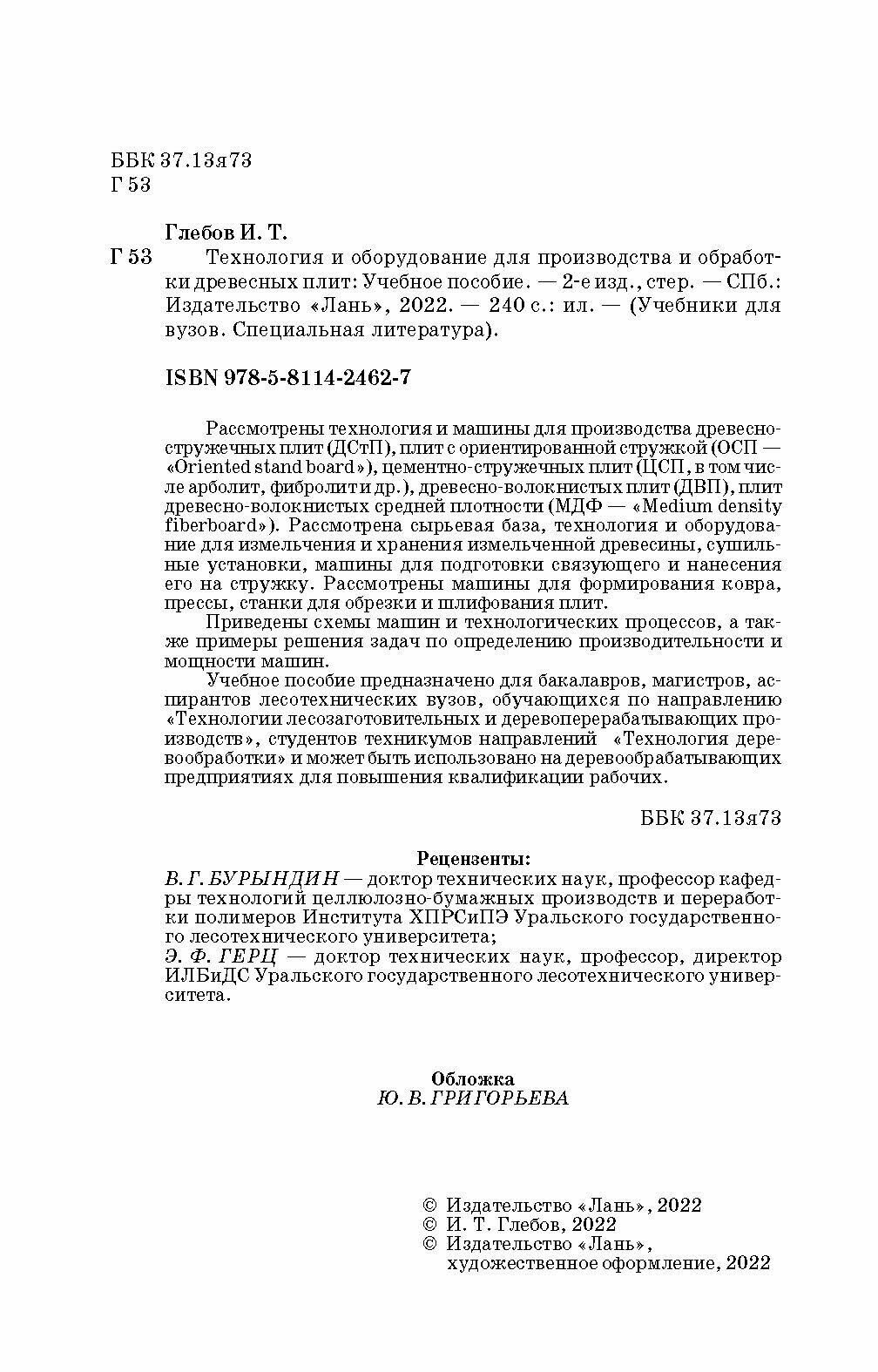 Технология и оборудование для производства и обработки древесных плит (И. Т. Глебов); Издательство ЛАНЬ, 2019