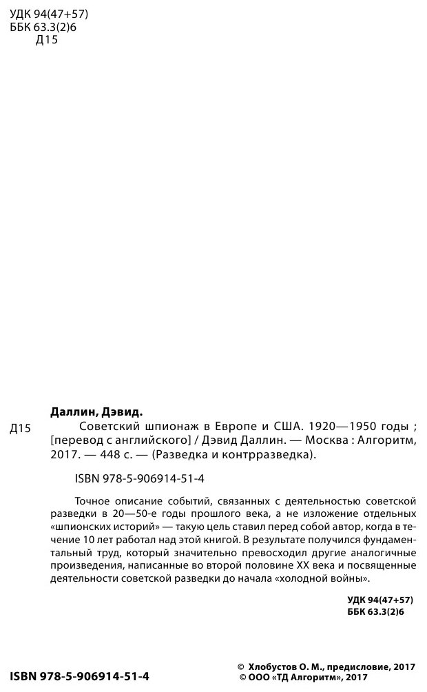 Советский шпионаж в Европе и США. 1920-1950 годы (Дэвид Даллин); Алисторус, 2017