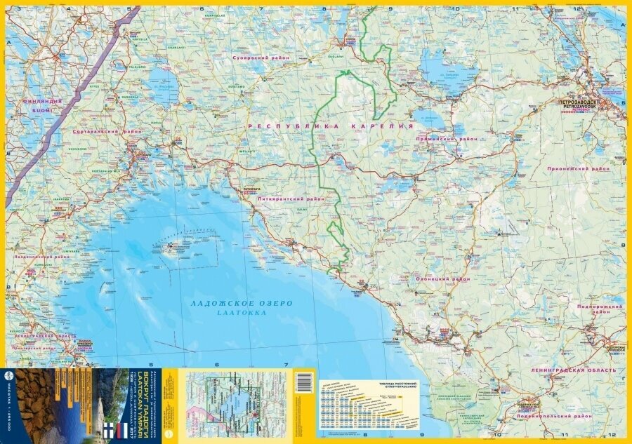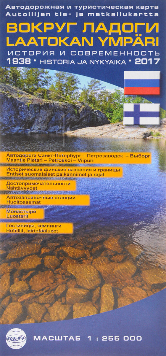 Автодорожная и туристическая карта для путешествий вокруг Ладожского озера, на Онежское озеро и в Петрозаводск, Сортавалу и Выборг. Автодорога Санкт-Петербург Петрозаводск Выборг Исторические финские названия и границы Достопримечательности с небольшим описанием и фотографиями Автозаправочные станции Монастыри Гостиницы, кемпинги Будет интересна как российским, так и финским туристам. Масштаб 1:255000. Размеры карты 100 см х 138 см. ISBN:978-5-91704-075-2