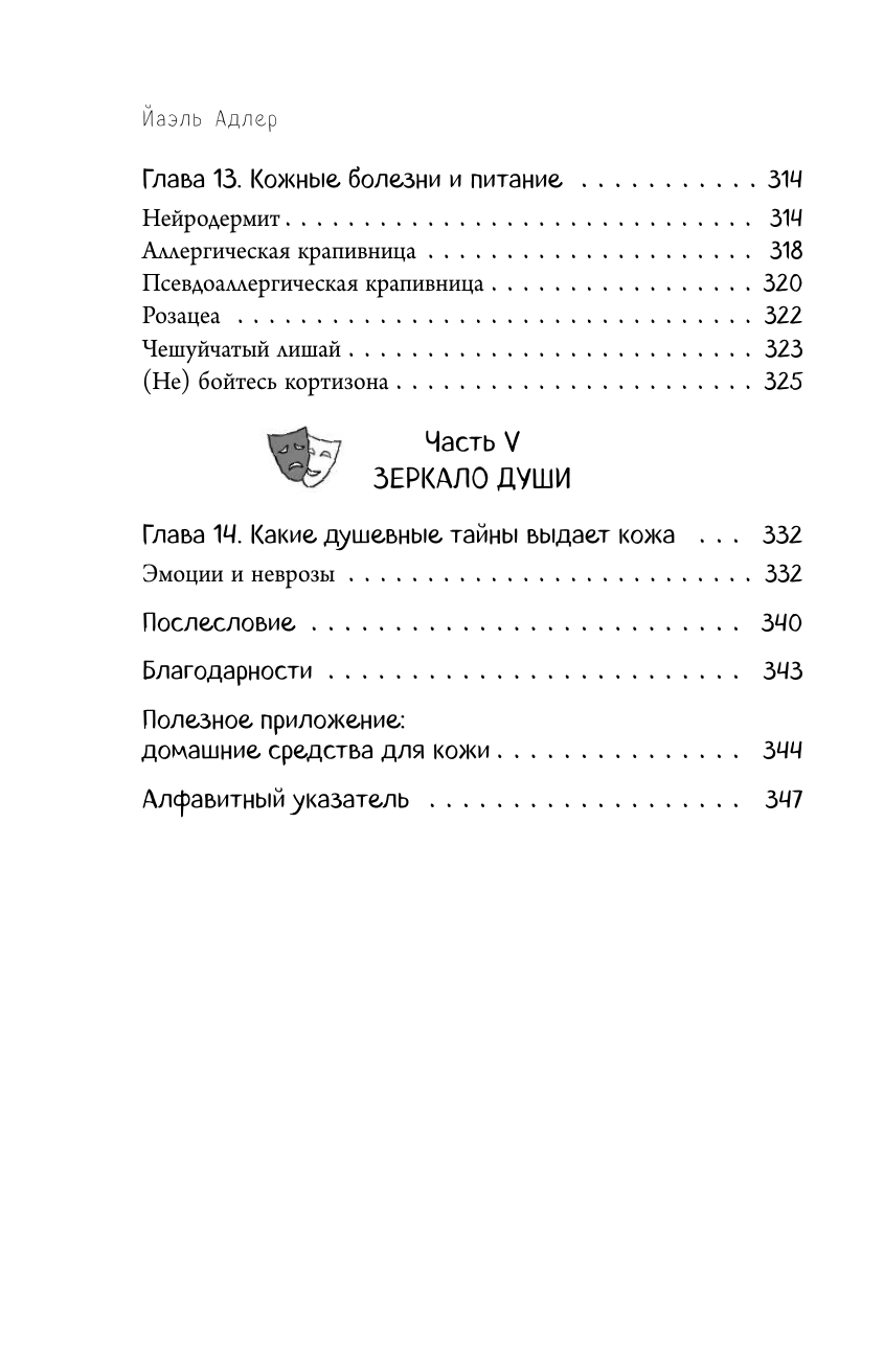 В своей книге "Что скрывает кожа" Йаэль Адлер рассказывает об устройстве и работе этого удивительного органа. Вы узнаете обо всем, что имеет к ней отношение: комариных укусах, прыщиках, растяжках, аллергиях, шрамах, родинках, запахах, косметике, загаре, чувствительности, боли, заболеваниях и многом другом. А лучше узнав этот удивительный орган, станете лучше понимать и себя.