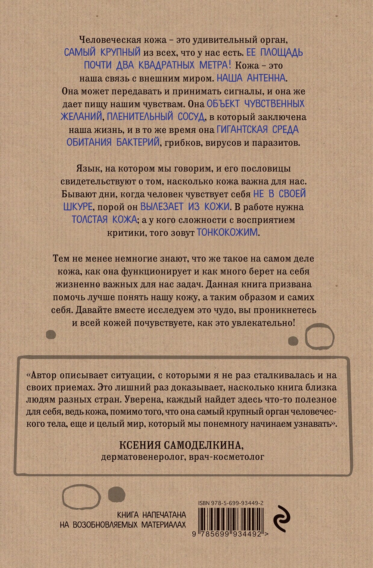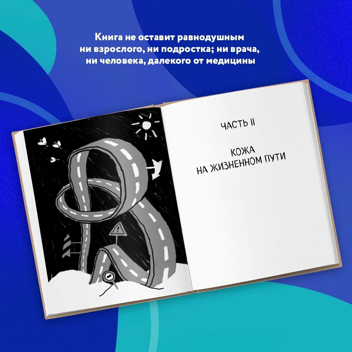 Во-первых, книга внешне притягательна. Небольшая дань крафтовости на обложке. Белые страницы,хороший шрифт. Читать невероятно удобно. Во-вторых, нет каких-то сложных слов и замудренных предложений. Есть куча разных сравнений , что безумно облегчает процесс понимания и осознавания. Нравится , что подняты многие важные темы. Не просто отписка о самом главном, а постепенное перебегание всего. Начиная от слоёв и клеток кожи , переходя на различные влияния солнца/пищи и заканчивая все различными заболеваниями. Книга полезна не только для узнавания своего организма , но и для того что бы открыть для себя важные составляющие привычного режима и понять что ты многое делал не так. Эту книгу все же стоит читать , она подарит вам прекрасную гармонию полезной информации и хорошего написания.