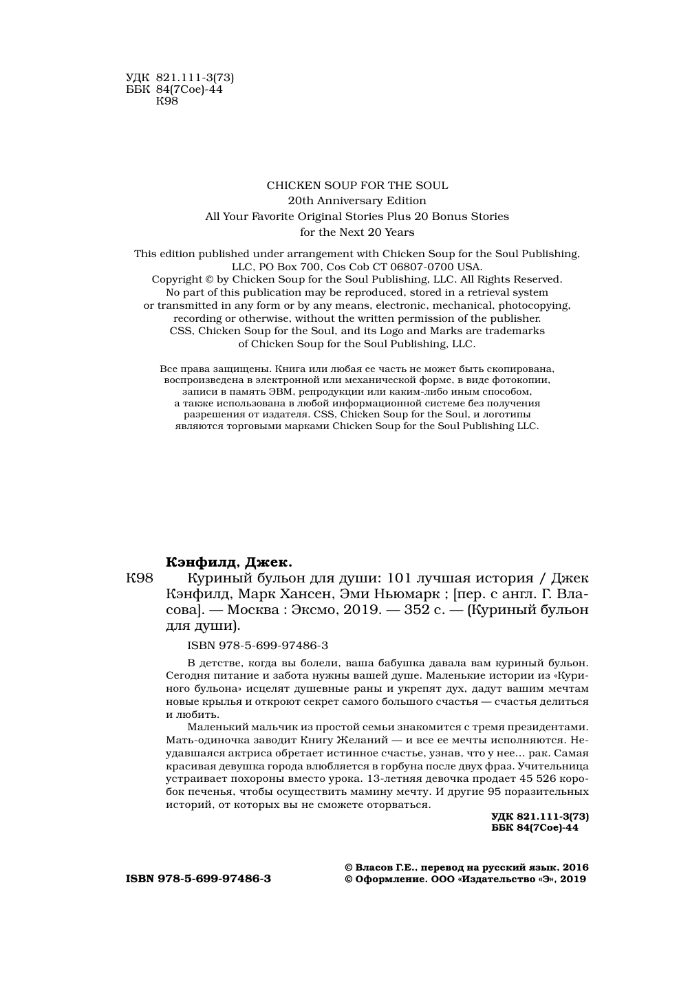 Куриный бульон для души. 101 лучшая история (Власов Герман Евгеньевич (переводчик), Ньюмарк Эми (соавтор), Хансен Марк Виктор (соавтор), Кэнфилд Джек); Эксмо, 2017