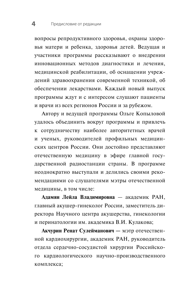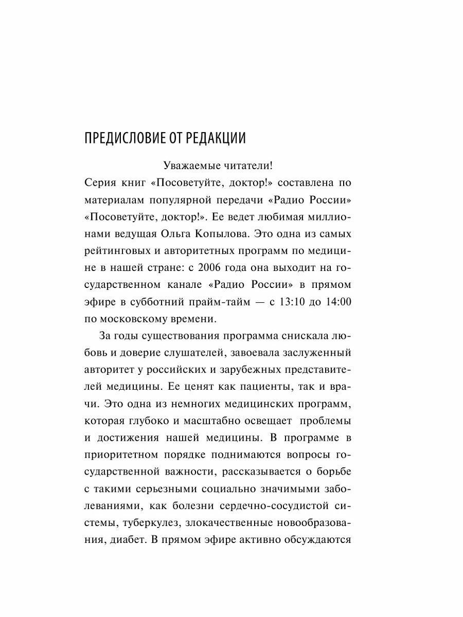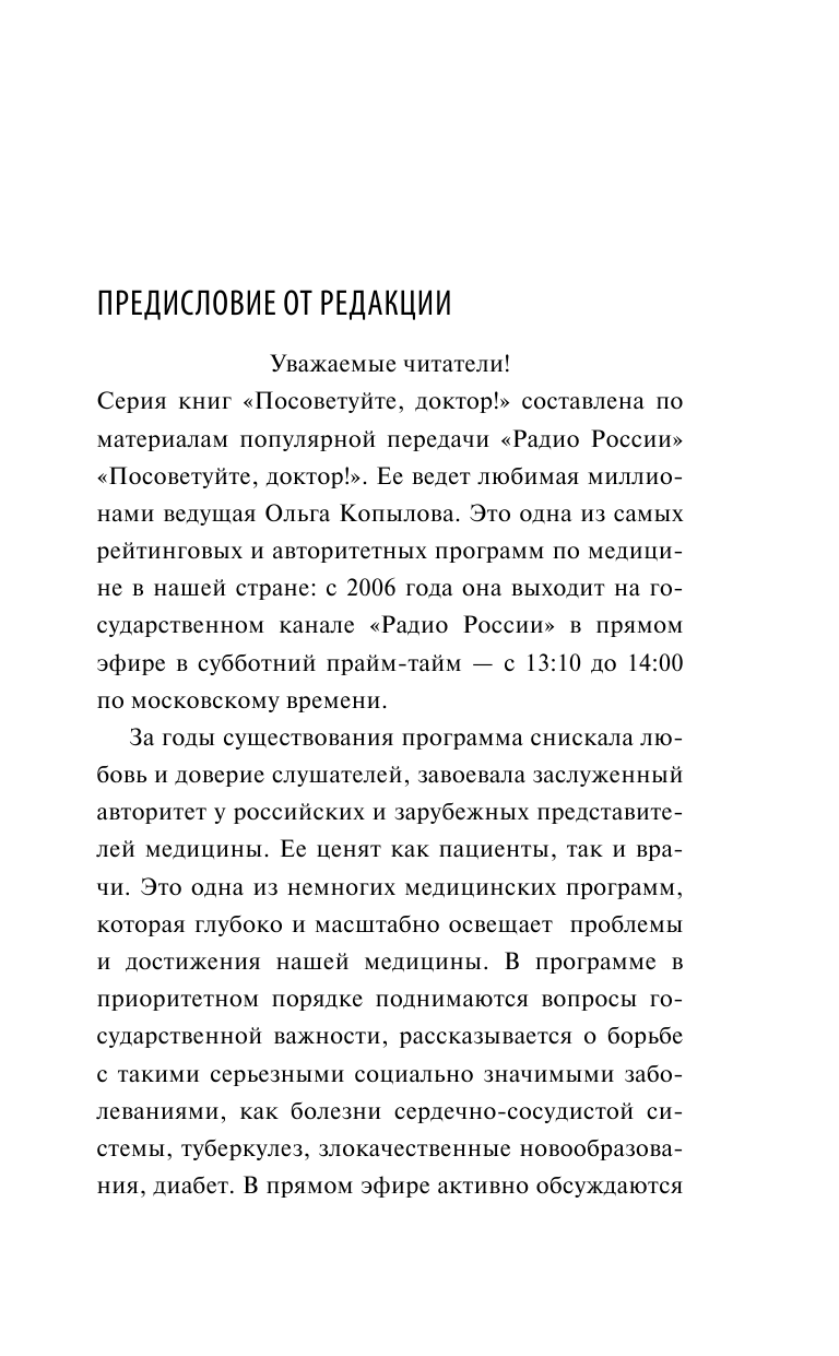 Слушаю Ольгу в радиопрограмме "Посоветуйте доктор!", очень важные темы поднимают по здоровью тех или иных органов, а главное квалифицированные врачи дают доступные советы поддержания организма в оптимальном состоянии. В книге также много вопросов и ответов, адреса, телефоны медицинских учреждений (все под рукой, удобно). Книга написана доступным языком для общей аудитории. Бумага газетная, но тем она и доступней по цене и она легче, чем мелованная.Каждый может найти для себя полезную информацию. Будьте здоровы!!!